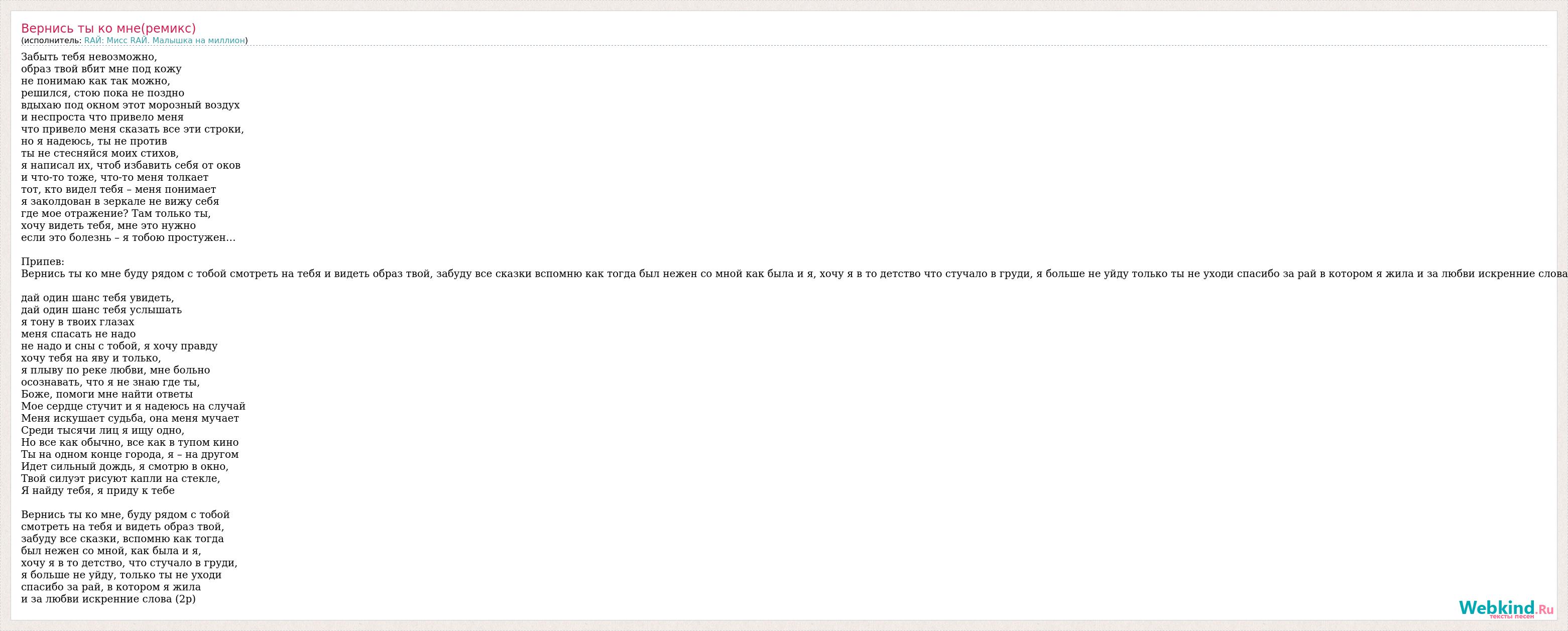 Забыть тебя невозможно, образ твой вбит мне под кожу не понимаю как так можно, решился, стою пока не поздно вдыхаю под окном этот морозный воздух и неспроста что привело меня что привело меня сказать все эти строки, но я надеюсь, ты не против ты не стесняйся моих стихов, я написал их, чтоб избавить себя от оков и что-то тоже, что-то меня толкает тот, кто видел тебя – меня понимает я заколдован в зеркале не вижу себя где мое отражение? Там только ты, хочу видеть тебя, мне это нужно если это болезнь – я тобою простужен… Припев: Вернись ты ко мне буду рядом с тобой смотреть на тебя и видеть образ твой, забуду все сказки вспомню как тогда был нежен со мной как была и я, хочу я в то детство что стучало в груди, я больше не уйду только ты не уходи спасибо за рай в котором я жила и за любви искренние слова дай один шанс тебя увидеть, дай один шанс тебя услышать я тону в твоих глазах меня спасать не надо не надо и сны с тобой, я хочу правду хочу тебя на яву и только, я плыву по реке любви, мне больно осознавать, что я не знаю где ты, Боже, помоги мне найти ответы Мое сердце стучит и я надеюсь на случай Меня искушает судьба, она меня мучает Среди тысячи лиц я ищу одно, Но все как обычно, все как в тупом кино Ты на одном конце города, я – на другом Идет сильный дождь, я смотрю в окно, Твой силуэт рисуют капли на стекле, Я найду тебя, я приду к тебе Вернись ты ко мне, буду рядом с тобой смотреть на тебя и видеть образ твой, забуду все сказки, вспомню как тогда был нежен со мной, как была и я, хочу я в то детство, что стучало в груди, я больше не уйду, только ты не уходи спасибо за рай, в котором я жила и за любви искренние слова (2р)