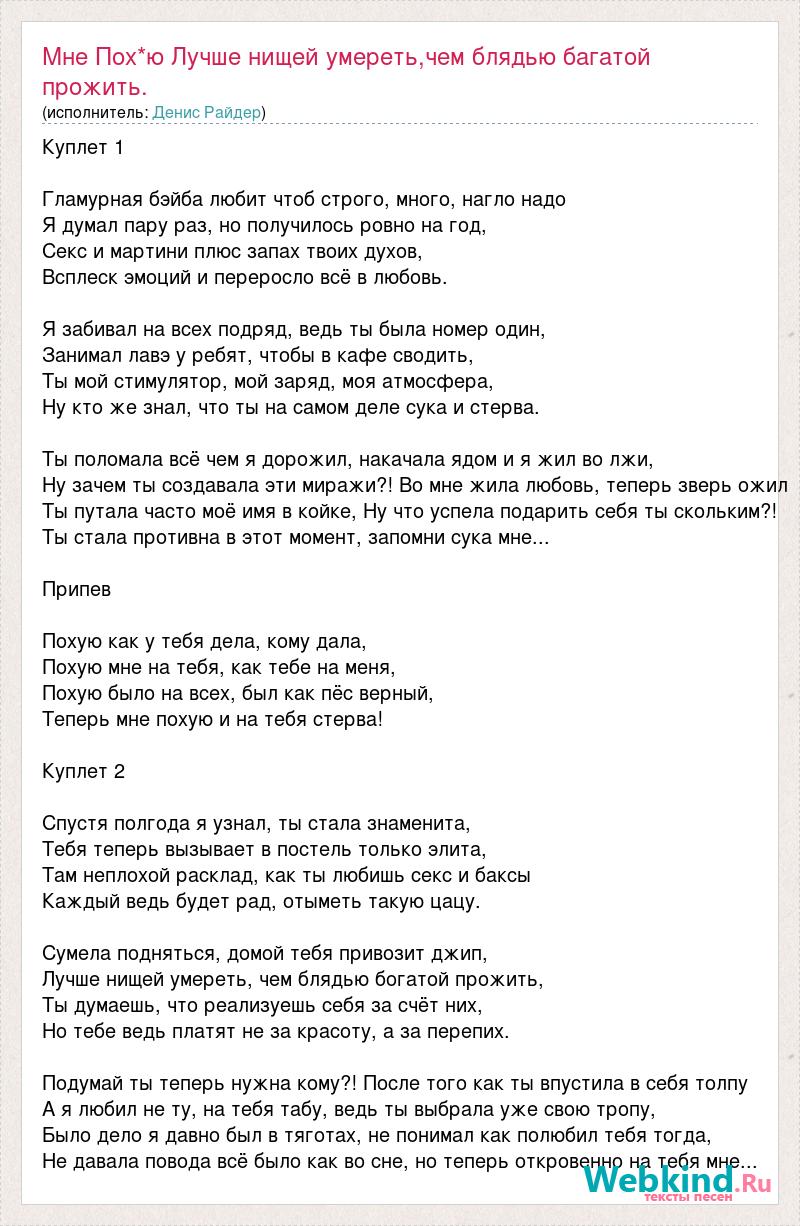 А как ты думаешь, о чем песня "Мне Пох*ю Лучше нищей умереть,чем блядью багатой прожить." ?