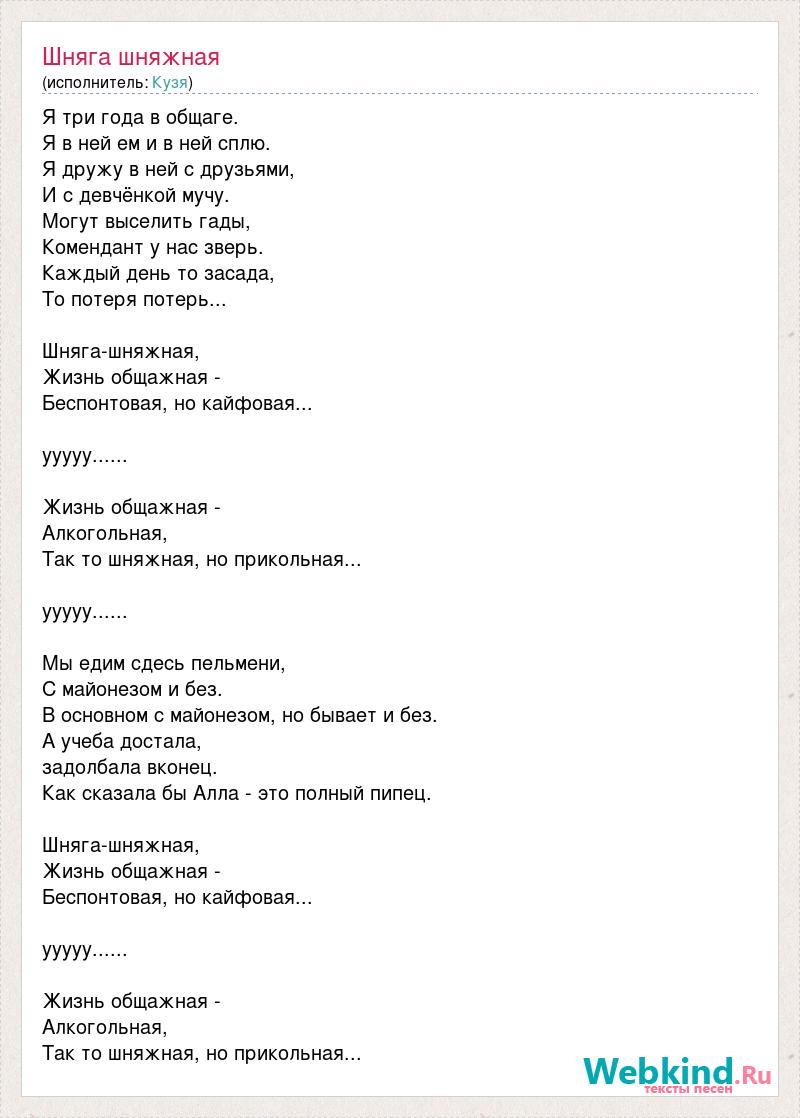 Я три года в общаге. Я в ней ем и в ней сплю. Я дружу в ней с друзьями, И с девчёнкой мучу. Могут выселить гады, Комендант у нас зверь. Каждый день то засада, То потеря потерь... Шняга-шняжная, Жизнь общажная - Беспонтовая, но кайфовая... ууууу...... Жизнь общажная - Алкогольная, Так то шняжная, но прикольная... ууууу...... Мы едим сдесь пельмени, С майонезом и без. В основном с майонезом, но бывает и без. А учеба достала, задолбала вконец. Как сказала бы Алла - это полный пипец. Шняга-шняжная, Жизнь общажная - Беспонтовая, но кайфовая... ууууу...... Жизнь общажная - Алкогольная, Так то шняжная, но прикольная...