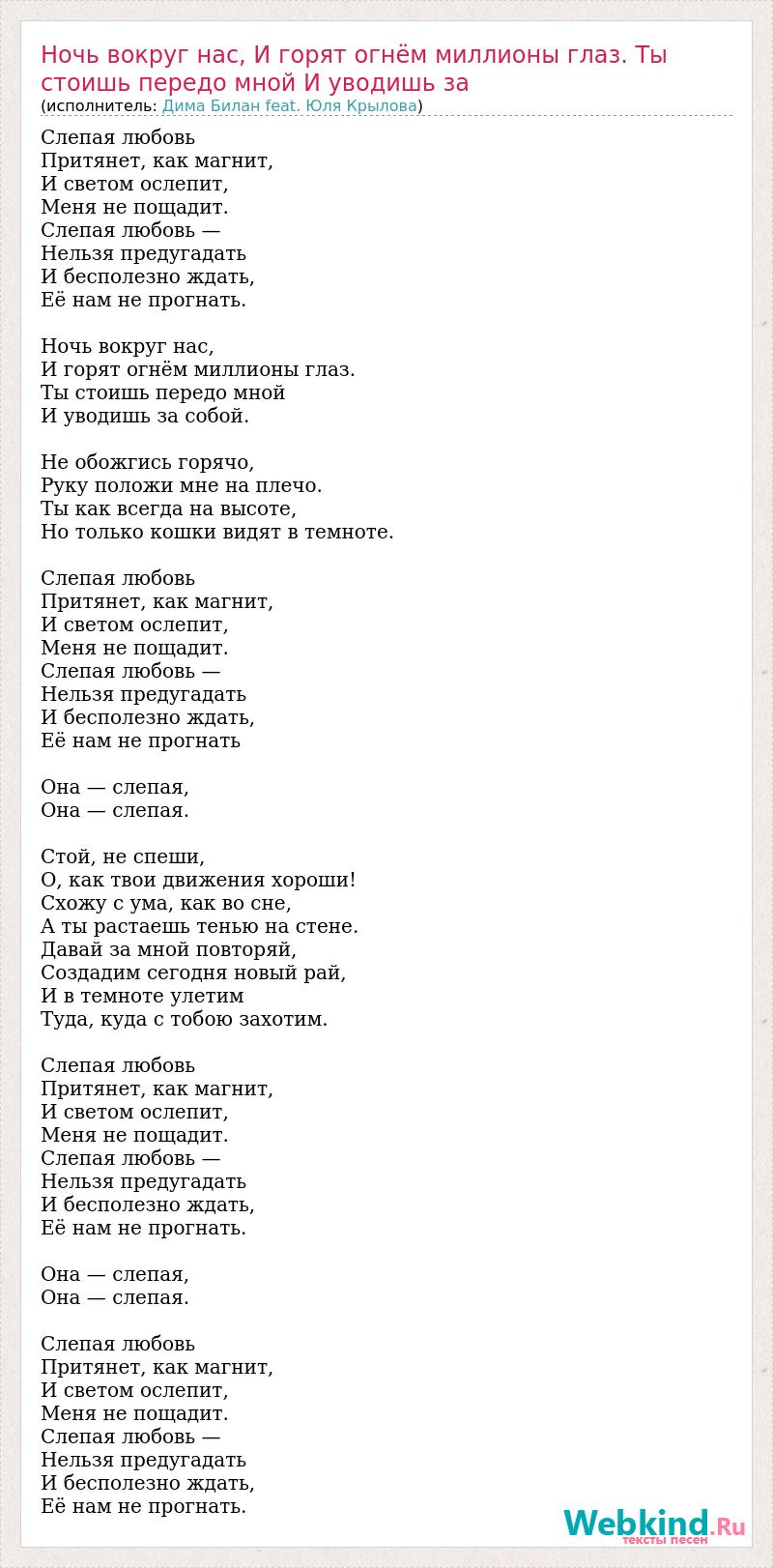 Главная→Исполнители→Дима Билан feat. Юля Крылова→Ночь вокруг нас, И горят огнём миллионы глаз. Ты стоишь передо мной И у