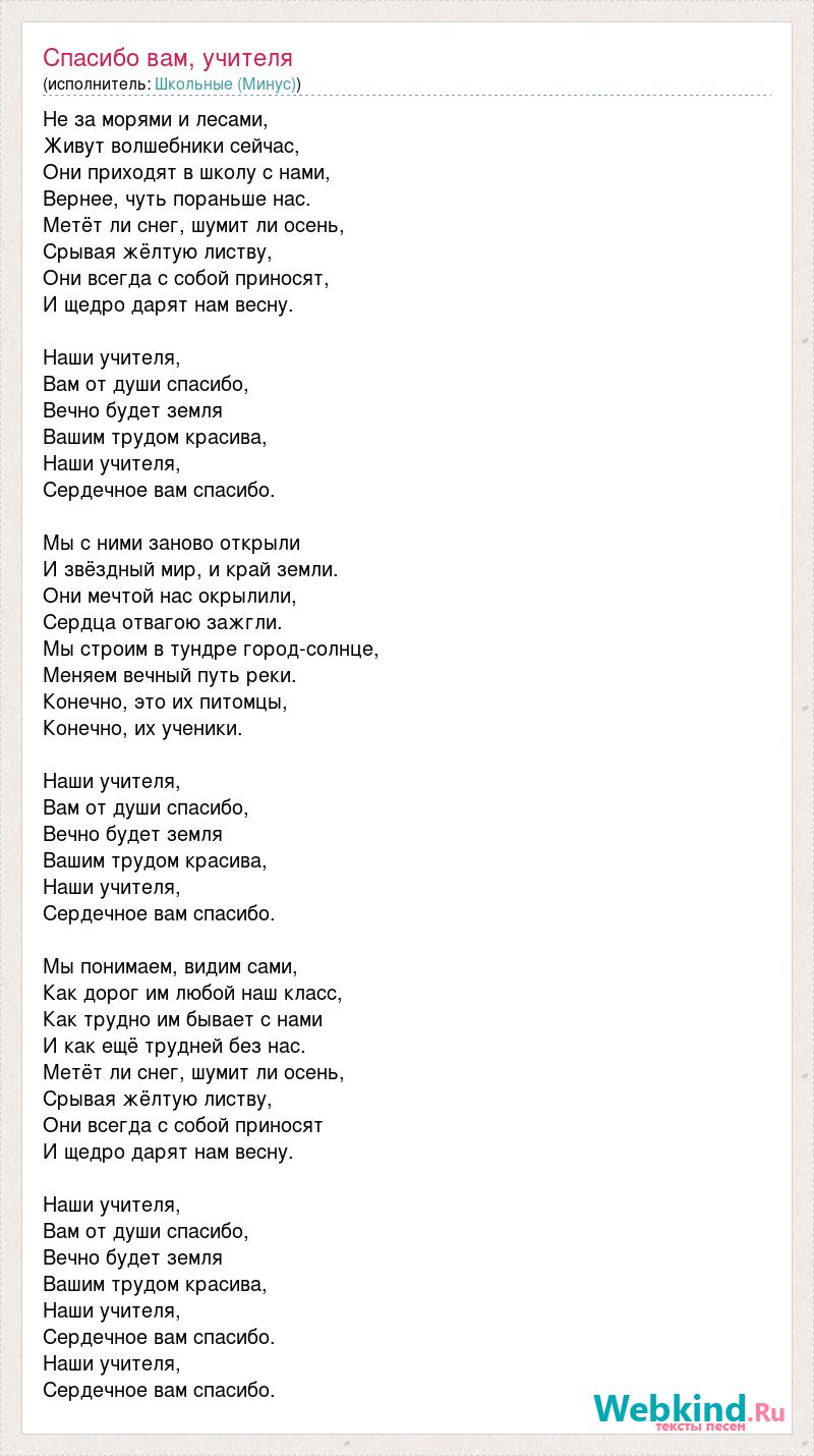 Не за морями и лесами, Живут волшебники сейчас, Они приходят в школу с нами, Вернее, чуть пораньше нас. Метёт ли снег, шумит ли осень, Срывая жёлтую листву, Они всегда с собой приносят, И щедро дарят нам весну. Наши учителя, Вам от души спасибо, Вечно будет земля Вашим трудом красива, Наши учителя, Сердечное вам спасибо. Мы с ними заново открыли И звёздный мир, и край земли. Они мечтой нас окрылили, Сердца отвагою зажгли. Мы строим в тундре город-солнце, Меняем вечный путь реки. Конечно, это их питомцы, Конечно, их ученики. Наши учителя, Вам от души спасибо, Вечно будет земля Вашим трудом красива, Наши учителя, Сердечное вам спасибо. Мы понимаем, видим сами, Как дорог им любой наш класс, Как трудно им бывает с нами И как ещё трудней без нас. Метёт ли снег, шумит ли осень, Срывая жёлтую листву, Они всегда с собой приносят И щедро дарят нам весну. Наши учителя, Вам от души спасибо, Вечно будет земля Вашим трудом красива, Наши учителя, Сердечное вам спасибо. Наши учителя, Сердечное вам спасибо.