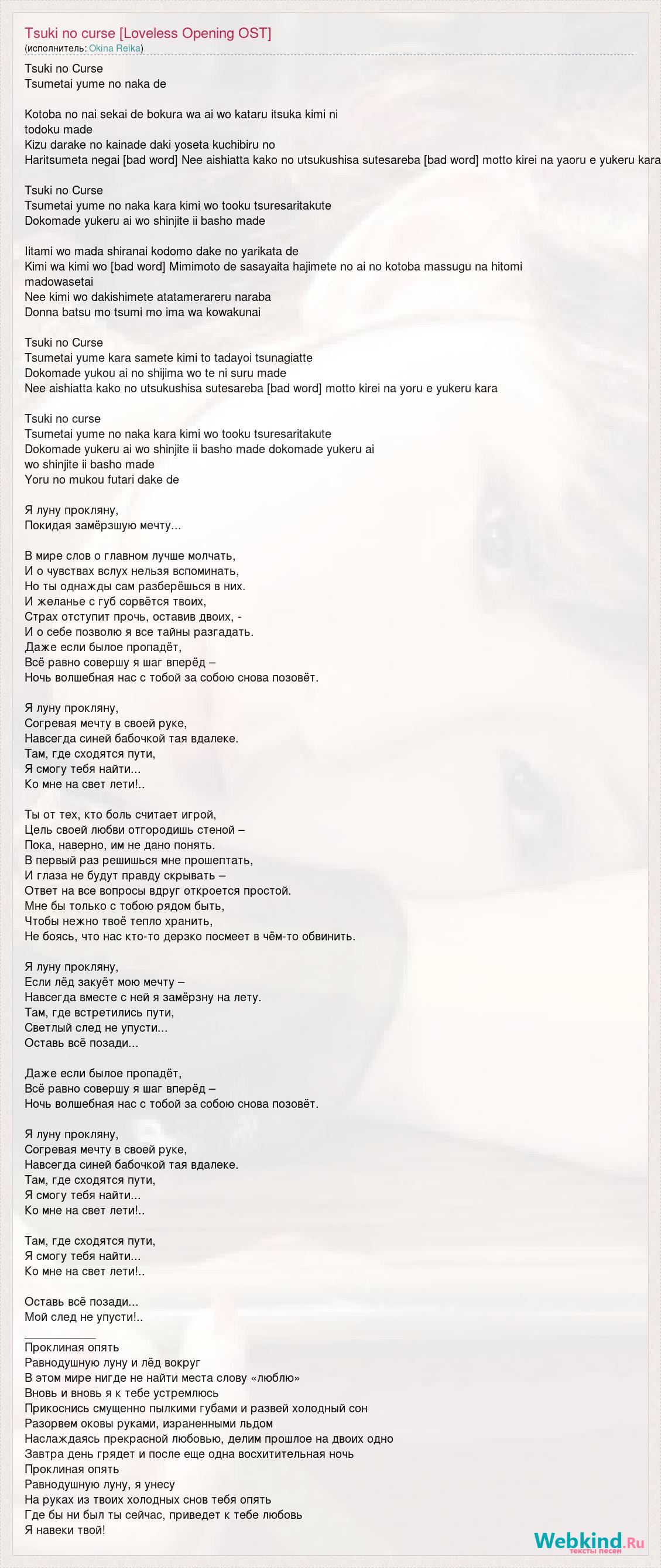 Tsuki no Curse Tsumetai yume no naka de Kotoba no nai sekai de bokura wa ai wo kataru itsuka kimi ni todoku made Kizu darake no kainade daki yoseta kuchibiru no Haritsumeta negai [bad word] Nee aishiatta kako no utsukushisa sutesareba [bad word] motto kirei na yaoru e yukeru kara Tsuki no Curse Tsumetai yume no naka kara kimi wo tooku tsuresaritakute Dokomade yukeru ai wo shinjite ii basho made Iitami wo mada shiranai kodomo dake no yarikata de Kimi wa kimi wo [bad word] Mimimoto de sasayaita hajimete no ai no kotoba massugu na hitomi madowasetai Nee kimi wo dakishimete atatamerareru naraba Donna batsu mo tsumi mo ima wa kowakunai Tsuki no Curse Tsumetai yume kara samete kimi to tadayoi tsunagiatte Dokomade yukou ai no shijima wo te ni suru made Nee aishiatta kako no utsukushisa sutesareba [bad word] motto kirei na yoru e yukeru kara Tsuki no curse Tsumetai yume no naka kara kimi wo tooku tsuresaritakute Dokomade yukeru ai wo shinjite ii basho made dokomade yukeru ai wo shinjite ii basho made Yoru no mukou futari dake de Я луну прокляну, Покидая замёрзшую мечту... В мире слов о главном лучше молчать, И о чувствах вслух нельзя вспоминать, Но ты однажды сам разберёшься в них. И желанье с губ сорвётся твоих, Страх отступит прочь, оставив двоих, - И о себе позволю я все тайны разгадать. Даже если былое пропадёт, Всё равно совершу я шаг вперёд – Ночь волшебная нас с тобой за собою снова позовёт. Я луну прокляну, Согревая мечту в своей руке, Навсегда синей бабочкой тая вдалеке. Там, где сходятся пути, Я смогу тебя найти... Ко мне на свет лети!.. Ты от тех, кто боль считает игрой, Цель своей любви отгородишь стеной – Пока, наверно, им не дано понять. В первый раз решишься мне прошептать, И глаза не будут правду скрывать – Ответ на все вопросы вдруг откроется простой. Мне бы только с тобою рядом быть, Чтобы нежно твоё тепло хранить, Не боясь, что нас кто-то дерзко посмеет в чём-то обвинить. Я луну прокляну, Если лёд закуёт мою мечту – Навсегда вместе с ней я замёрзну на лету. Там, где встретились пути, Светлый след не упусти... Оставь всё позади... Даже если былое пропадёт, Всё равно совершу я шаг вперёд – Ночь волшебная нас с тобой за собою снова позовёт. Я луну прокляну, Согревая мечту в своей руке, Навсегда синей бабочкой тая вдалеке. Там, где сходятся пути, Я смогу тебя найти... Ко мне на свет лети!.. Там, где сходятся пути, Я смогу тебя найти... Ко мне на свет лети!.. Оставь всё позади... Мой след не упусти!.. ___________ Проклиная опять Равнодушную луну и лёд вокруг В этом мире нигде не найти места слову «люблю» Вновь и вновь я к тебе устремлюсь Прикоснись смущенно пылкими губами и развей холодный сон Разорвем оковы руками, израненными льдом Наслаждаясь прекрасной любовью, делим прошлое на двоих одно Завтра день грядет и после еще одна восхитительная ночь Проклиная опять Равнодушную луну, я унесу На руках из твоих холодных снов тебя опять Где бы ни был ты сейчас, приведет к тебе любовь Я навеки твой!