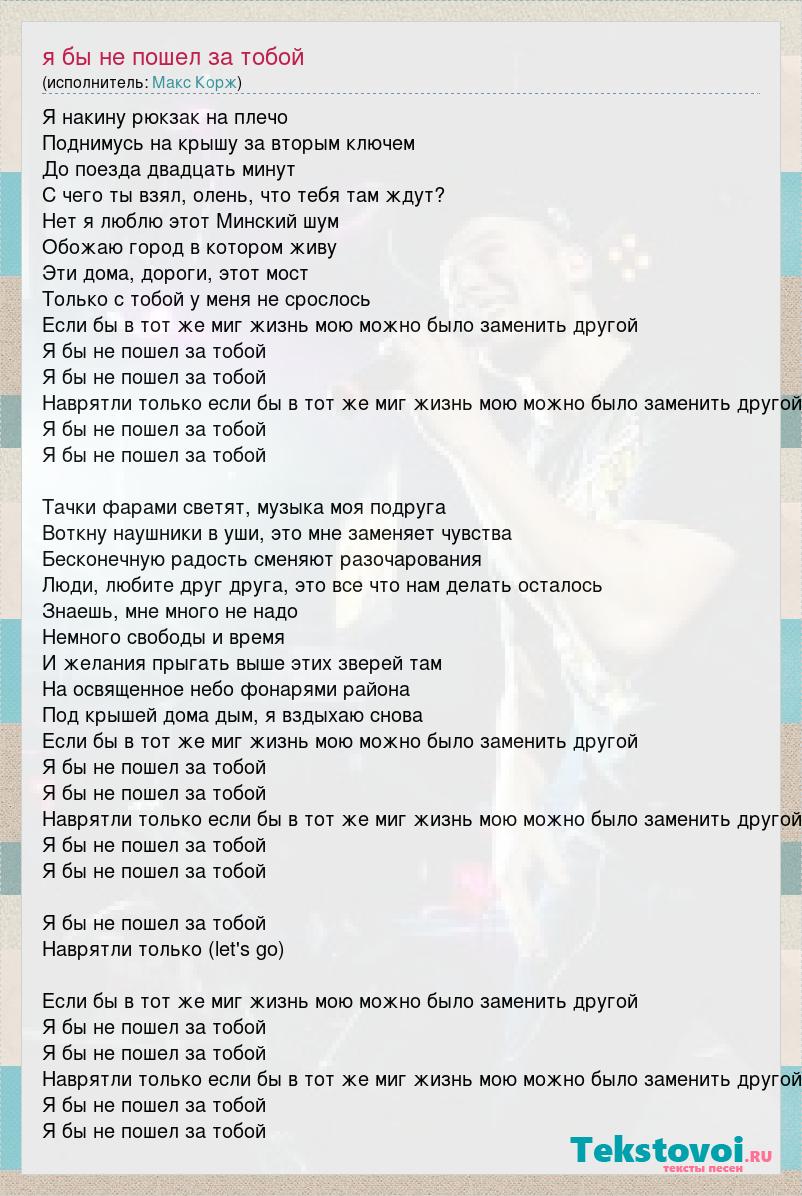 Я накину рюкзак на плечо Поднимусь на крышу за вторым ключем До поезда двадцать минут С чего ты взял, олень, что тебя там ждут? Нет я люблю этот Минский шум Обожаю город в котором живу Эти дома, дороги, этот мост Только с тобой у меня не срослось Если бы в тот же миг жизнь мою можно было заменить другой Я бы не пошел за тобой Я бы не пошел за тобой Наврятли только если бы в тот же миг жизнь мою можно было заменить другой Я бы не пошел за тобой Я бы не пошел за тобой Тачки фарами светят, музыка моя подруга Воткну наушники в уши, это мне заменяет чувства Бесконечную радость сменяют разочарования Люди, любите друг друга, это все что нам делать осталось Знаешь, мне много не надо Немного свободы и время И желания прыгать выше этих зверей там На освященное небо фонарями района Под крышей дома дым, я вздыхаю снова Если бы в тот же миг жизнь мою можно было заменить другой Я бы не пошел за тобой Я бы не пошел за тобой Наврятли только если бы в тот же миг жизнь мою можно было заменить другой Я бы не пошел за тобой Я бы не пошел за тобой Я бы не пошел за тобой Наврятли только (let's go) Если бы в тот же миг жизнь мою можно было заменить другой Я бы не пошел за тобой Я бы не пошел за тобой Наврятли только если бы в тот же миг жизнь мою можно было заменить другой Я бы не пошел за тобой Я бы не пошел за тобой