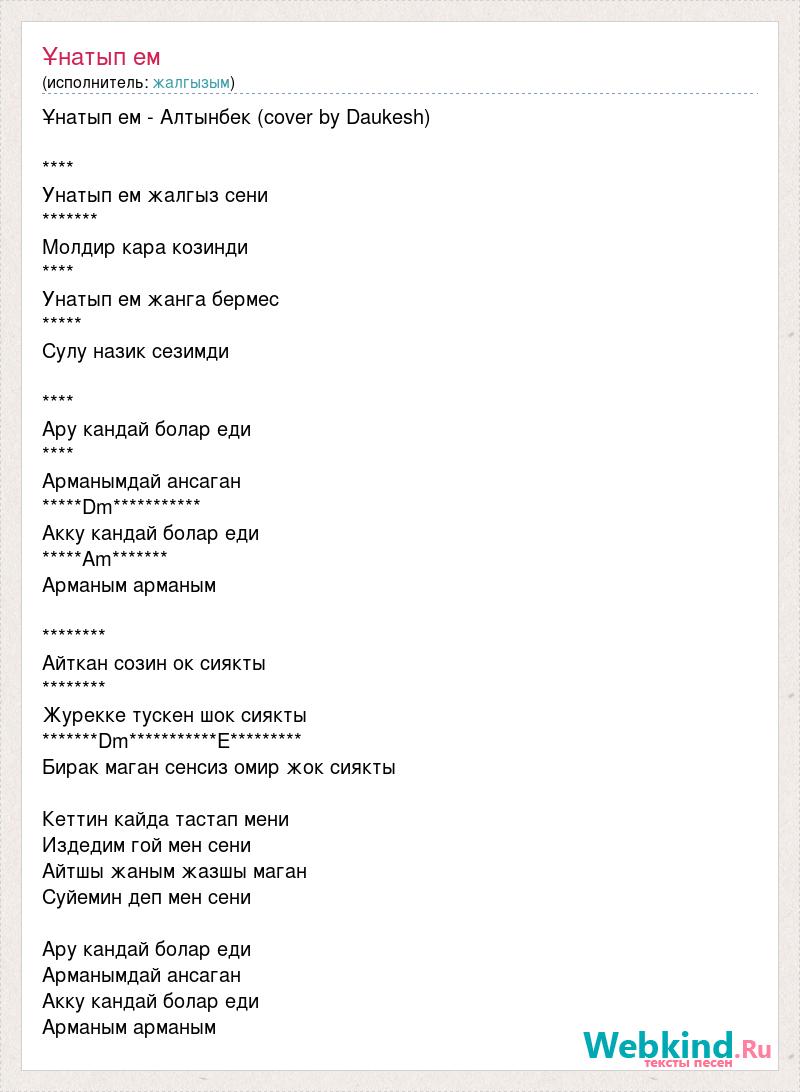 Ұнатып ем - Алтынбек (cover by Daukesh) **** Унатып ем жалгыз сени ******* Молдир кара козинди **** Унатып ем жанга бермес ***** Сулу назик сезимди **** Ару кандай болар еди **** Арманымдай ансаган *****Dm*********** Акку кандай болар еди *****Am******* Арманым арманым ******** Айткан созин ок сиякты ******** Журекке тускен шок сиякты *******Dm***********E********* Бирак маган сенсиз омир жок сиякты Кеттин кайда тастап мени Издедим гой мен сени Айтшы жаным жазшы маган Суйемин деп мен сени Ару кандай болар еди Арманымдай ансаган Акку кандай болар еди Арманым арманым