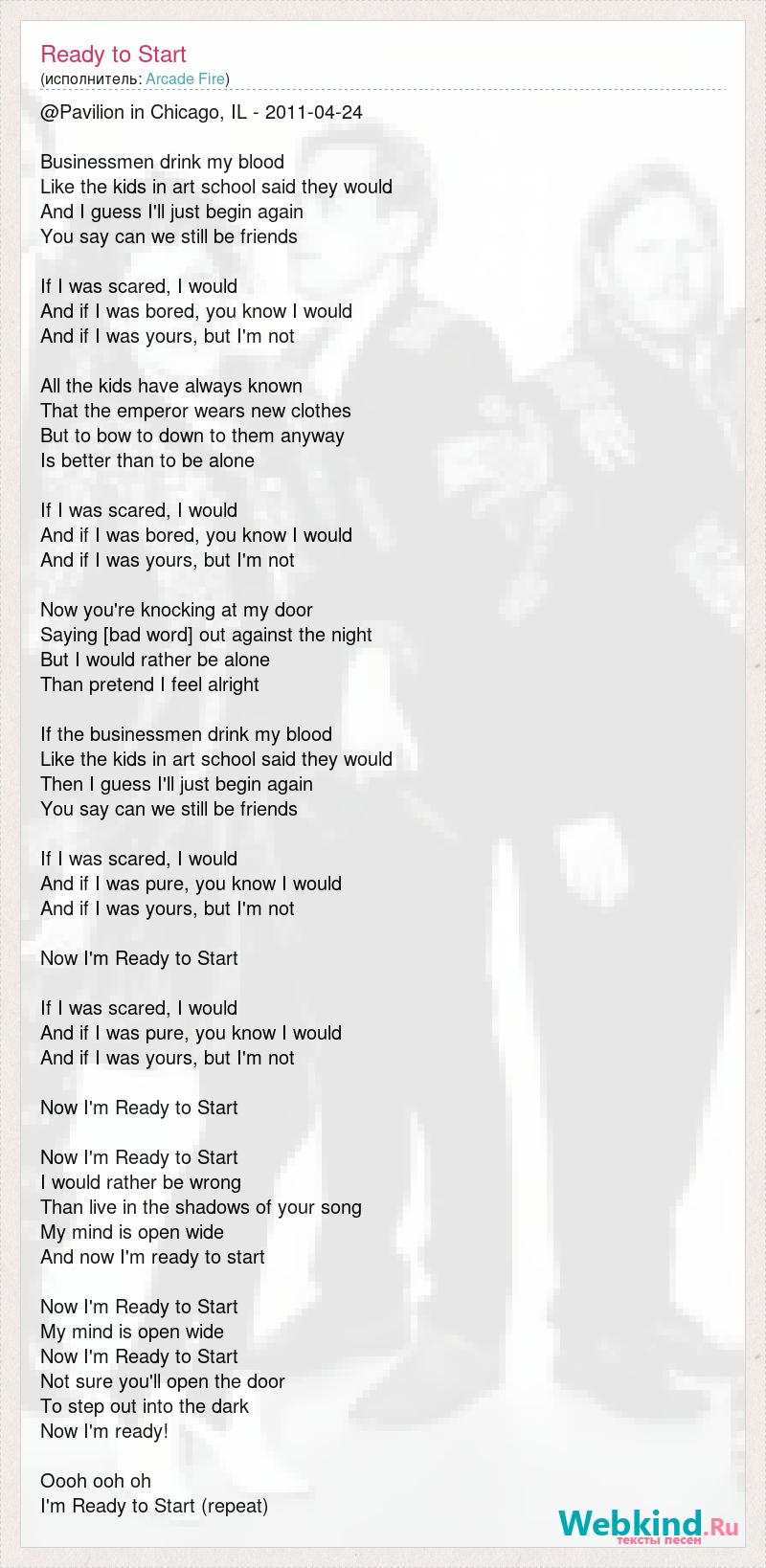 @Pavilion in Chicago, IL - 2011-04-24 Businessmen drink my blood Like the kids in art school said they would And I guess I'll just begin again You say can we still be friends If I was scared, I would And if I was bored, you know I would And if I was yours, but I'm not All the kids have always known That the emperor wears new clothes But to bow to down to them anyway Is better than to be alone If I was scared, I would And if I was bored, you know I would And if I was yours, but I'm not Now you're knocking at my door Saying [bad word] out against the night But I would rather be alone Than pretend I feel alright If the businessmen drink my blood Like the kids in art school said they would Then I guess I'll just begin again You say can we still be friends If I was scared, I would And if I was pure, you know I would And if I was yours, but I'm not Now I'm Ready to Start If I was scared, I would And if I was pure, you know I would And if I was yours, but I'm not Now I'm Ready to Start Now I'm Ready to Start I would rather be wrong Than live in the shadows of your song My mind is open wide And now I'm ready to start Now I'm Ready to Start My mind is open wide Now I'm Ready to Start Not sure you'll open the door To step out into the dark Now I'm ready! Oooh ooh oh I'm Ready to Start (repeat)