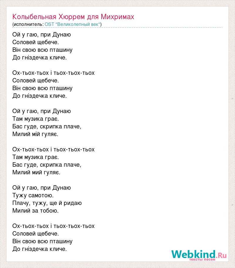 Ой у гаю, при Дунаю Соловей щебече. Він свою всю пташину До гніздечка кличе. Ох-тьох-тьох і тьох-тьох-тьох Соловей щебече. Він свою всю пташину До гніздечка кличе. Ой у гаю, при Дунаю Там музика грає. Бас гуде, скрипка плаче, Милий мій гуляє. Ох-тьох-тьох і тьох-тьох-тьох Там музика грає. Бас гуде, скрипка плаче, Милий мий гуляє. Ой у гаю, при Дунаю Тужу самотою. Плачу, тужу, ще й ридаю Милий за тобою. Ох-тьох-тьох і тьох-тьох-тьох Соловей щебече. Він свою всю пташину До гніздечка кличе.