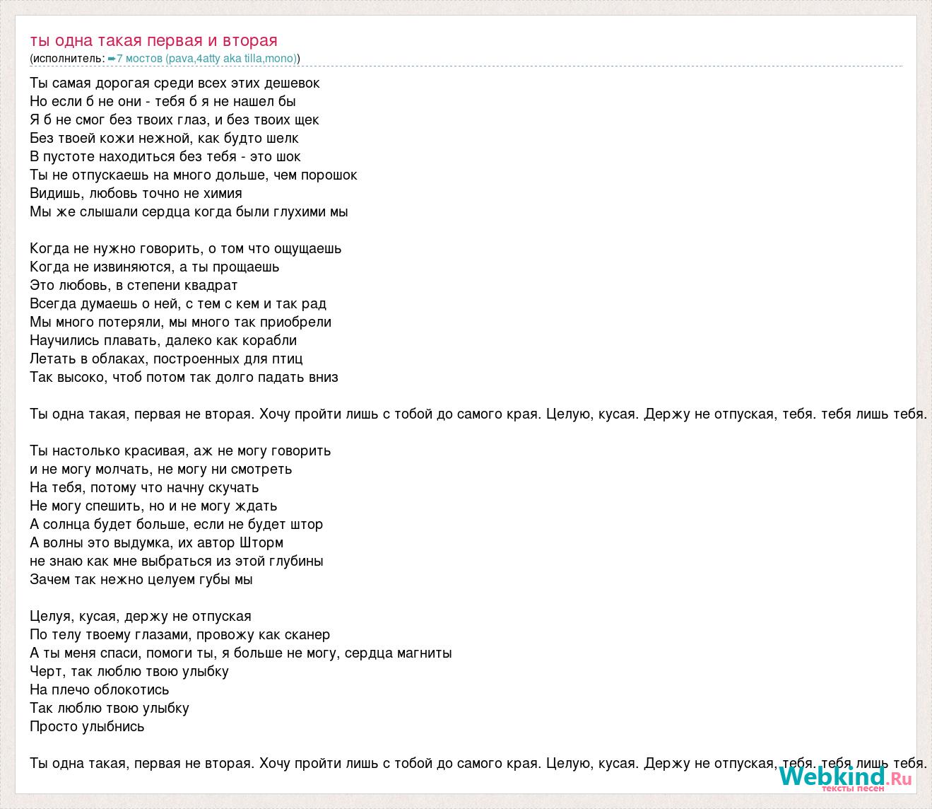 Ты самая дорогая среди всех этих дешевок Но если б не они - тебя б я не нашел бы Я б не смог без твоих глаз, и без твоих щек Без твоей кожи нежной, как будто шелк В пустоте находиться без тебя - это шок Ты не отпускаешь на много дольше, чем порошок Видишь, любовь точно не химия Мы же слышали сердца когда были глухими мы Когда не нужно говорить, о том что ощущаешь Когда не извиняются, а ты прощаешь Это любовь, в степени квадрат Всегда думаешь о ней, с тем с кем и так рад Мы много потеряли, мы много так приобрели Научились плавать, далеко как корабли Летать в облаках, построенных для птиц Так высоко, чтоб потом так долго падать вниз Ты одна такая, первая не вторая. Хочу пройти лишь с тобой до самого края. Целую, кусая. Держу не отпуская, тебя. тебя лишь тебя. Ты настолько красивая, аж не могу говорить и не могу молчать, не могу ни смотреть На тебя, потому что начну скучать Не могу спешить, но и не могу ждать А солнца будет больше, если не будет штор А волны это выдумка, их автор Шторм не знаю как мне выбраться из этой глубины Зачем так нежно целуем губы мы Целуя, кусая, держу не отпуская По телу твоему глазами, провожу как сканер А ты меня спаси, помоги ты, я больше не могу, сердца магниты Черт, так люблю твою улыбку На плечо облокотись Так люблю твою улыбку Просто улыбнись Ты одна такая, первая не вторая. Хочу пройти лишь с тобой до самого края. Целую, кусая. Держу не отпуская, тебя. тебя лишь тебя.