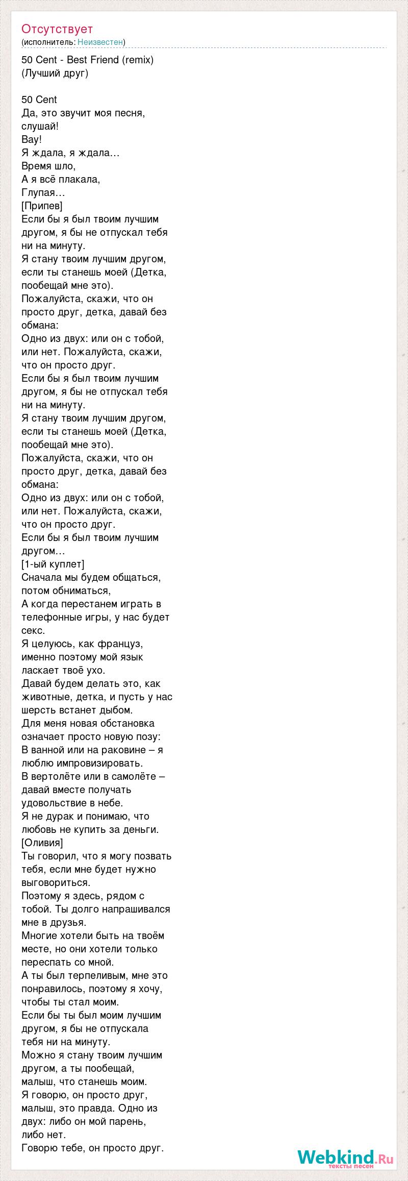 50 Cent - Best Friend (remix) (Лучший друг) 50 Cent Да, это звучит моя песня, слушай! Вау! Я ждала, я ждала… Время шло, А я всё плакала, Глупая… [Припев] Если бы я был твоим лучшим другом, я бы не отпускал тебя ни на минуту. Я стану твоим лучшим другом, если ты станешь моей (Детка, пообещай мне это). Пожалуйста, скажи, что он просто друг, детка, давай без обмана: Одно из двух: или он с тобой, или нет. Пожалуйста, скажи, что он просто друг. Если бы я был твоим лучшим другом, я бы не отпускал тебя ни на минуту. Я стану твоим лучшим другом, если ты станешь моей (Детка, пообещай мне это). Пожалуйста, скажи, что он просто друг, детка, давай без обмана: Одно из двух: или он с тобой, или нет. Пожалуйста, скажи, что он просто друг. Если бы я был твоим лучшим другом… [1-ый куплет] Сначала мы будем общаться, потом обниматься, А когда перестанем играть в телефонные игры, у нас будет секс. Я целуюсь, как француз, именно поэтому мой язык ласкает твоё ухо. Давай будем делать это, как животные, детка, и пусть у нас шерсть встанет дыбом. Для меня новая обстановка означает просто новую позу: В ванной или на раковине – я люблю импровизировать. В вертолёте или в самолёте – давай вместе получать удовольствие в небе. Я не дурак и понимаю, что любовь не купить за деньги. [Оливия] Ты говорил, что я могу позвать тебя, если мне будет нужно выговориться. Поэтому я здесь, рядом с тобой. Ты долго напрашивался мне в друзья. Многие хотели быть на твоём месте, но они хотели только переспать со мной. А ты был терпеливым, мне это понравилось, поэтому я хочу, чтобы ты стал моим. Если бы ты был моим лучшим другом, я бы не отпускала тебя ни на минуту. Можно я стану твоим лучшим другом, а ты пообещай, малыш, что станешь моим. Я говорю, он просто друг, малыш, это правда. Одно из двух: либо он мой парень, либо нет. Говорю тебе, он просто друг.