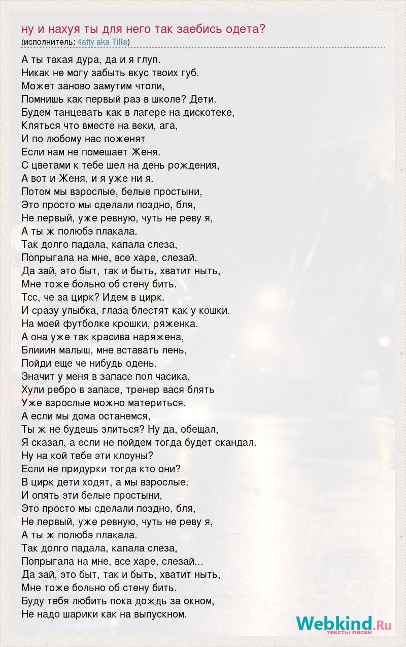 А ты такая дура, да и я глуп. Никак не могу забыть вкус твоих губ. Может заново замутим чтоли, Помнишь как первый раз в школе? Дети. Будем танцевать как в лагере на дискотеке, Кляться что вместе на веки, ага, И по любому нас поженят Если нам не помешает Женя. С цветами к тебе шел на день рождения, А вот и Женя, и я уже ни я. Потом мы взрослые, белые простыни, Это просто мы сделали поздно, бля, Не первый, уже ревную, чуть не реву я, А ты ж полюбэ плакала. Так долго падала, капала слеза, Попрыгала на мне, все харе, слезай. Да зай, это быт, так и быть, хватит ныть, Мне тоже больно об стену бить. Тсс, че за цирк? Идем в цирк. И сразу улыбка, глаза блестят как у кошки. На моей футболке крошки, ряженка. А она уже так красива наряжена, Блииин малыш, мне вставать лень, Пойди еще че нибудь одень. Значит у меня в запасе пол часика, Хули ребро в запасе, тренер вася блять Уже взрослые можно материться. А если мы дома останемся, Ты ж не будешь злиться? Ну да, обещал, Я сказал, а если не пойдем тогда будет скандал. Ну на кой тебе эти клоуны? Если не придурки тогда кто они? В цирк дети ходят, а мы взрослые. И опять эти белые простыни, Это просто мы сделали поздно, бля, Не первый, уже ревную, чуть не реву я, А ты ж полюбэ плакала. Так долго падала, капала слеза, Попрыгала на мне, все харе, слезай... Да зай, это быт, так и быть, хватит ныть, Мне тоже больно об стену бить. Буду тебя любить пока дождь за окном, Не надо шарики как на выпускном.