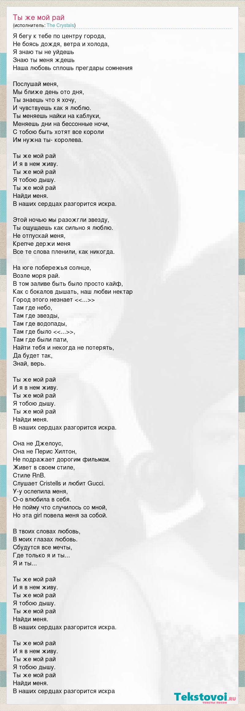Я бегу к тебе по центру города, Не боясь дождя, ветра и холода, Я знаю ты не уйдешь Знаю ты меня ждешь Наша любовь сплошь прегдары сомнения Послушай меня, Мы ближе день ото дня, Ты знаешь что я хочу, И чувствуешь как я люблю. Ты меняешь найки на каблуки, Меняешь дни на бессонные ночи, С тобою быть хотят все короли Им нужна ты- королева. Ты же мой рай И я в нем живу. Ты же мой рай Я тобою дышу. Ты же мой рай Найди меня. В наших сердцах разгорится искра. Этой ночью мы разожгли звезду, Ты ощущаешь как сильно я люблю. Не отпускай меня, Крепче держи меня Все те слова пленили, как никогда. На юге побережья cолнце, Возле моря рай. В том заливе быть было просто кайф, Как с бокалов дышать, наш любви нектар Город этого незнает <<...>> Там где небо, Там где звезды, Там где водопады, Там где было <<...>>, Там где были пати, Найти тебя и некогда не потерять, Да будет так, Знай, верь. Ты же мой рай И я в нем живу. Ты же мой рай Я тобою дышу. Ты же мой рай Найди меня. В наших сердцах разгорится искра. Она не Джелоус, Она не Перис Хилтон, Не подражает дорогим фильмам. Живет в своем стиле, Стиле RnB. Cлушает Cristells и любит Gucci. У-у ослепила меня, О-о влюбила в себя. Не пойму что случилось со мной, Но эта girl повела меня за собой. В твоих словах любовь, В моих глазах любовь. Сбудутся все мечты, Где только я и ты... Я и ты... Ты же мой рай И я в нем живу. Ты же мой рай Я тобою дышу. Ты же мой рай Найди меня. В наших сердцах разгорится искра. Ты же мой рай И я в нем живу. Ты же мой рай Я тобою дышу. Ты же мой рай Найди меня. В наших сердцах разгорится искра