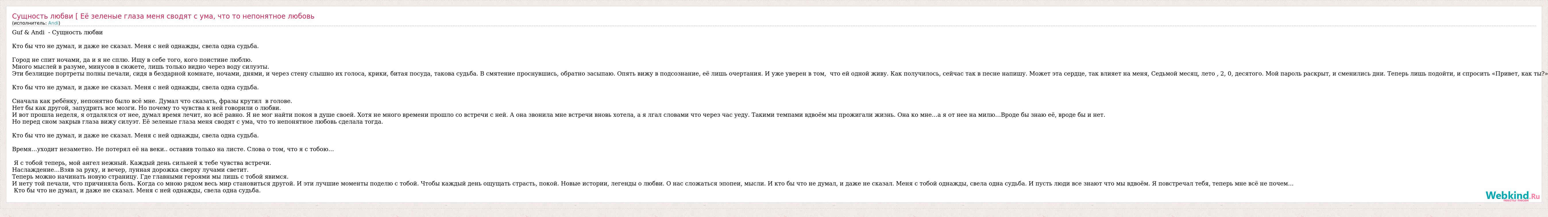 Guf & Andi - Сущность любви Кто бы что не думал, и даже не сказал. Меня с ней однажды, свела одна судьба. Город не спит ночами, да и я не сплю. Ищу в себе того, кого поистине люблю. Много мыслей в разуме, минусов в сюжете, лишь только видно через воду силуэты. Эти безлицие портреты полны печали, сидя в бездарной комнате, ночами, днями, и через стену слышно их голоса, крики, битая посуда, такова судьба. В смятение проснувшись, обратно засыпаю. Опять вижу в подсознание, её лишь очертания. И уже уверен в том, что ей одной живу. Как получилось, сейчас так в песне напишу. Может эта сердце, так влияет на меня, Седьмой месяц, лето , 2, 0, десятого. Мой пароль раскрыт, и сменились дни. Теперь лишь подойти, и спросить «Привет, как ты?» Кто бы что не думал, и даже не сказал. Меня с ней однажды, свела одна судьба. Сначала как ребёнку, непонятно было всё мне. Думал что сказать, фразы крутил в голове. Нет бы как другой, запудрить все мозги. Но почему то чувства к ней говорили о любви. И вот прошла неделя, я отдалялся от нее, думал время лечит, но всё равно. Я не мог найти покоя в душе своей. Хотя не много времени прошло со встречи с ней. А она звонила мне встречи вновь хотела, а я лгал словами что через час уеду. Такими темпами вдвоём мы прожигали жизнь. Она ко мне…а я от нее на милю…Вроде бы знаю её, вроде бы и нет. Но перед сном закрыв глаза вижу силуэт. Её зеленые глаза меня сводят с ума, что то непонятное любовь сделала тогда. Кто бы что не думал, и даже не сказал. Меня с ней однажды, свела одна судьба. Время…уходит незаметно. Не потерял её на веки.. оставив только на листе. Слова о том, что я с тобою… Я с тобой теперь, мой ангел нежный. Каждый день сильней к тебе чувства встречи. Наслаждение…Взяв за руку, и вечер, лунная дорожка сверху лучами светит. Теперь можно начинать новую страницу. Где главными героями мы лишь с тобой явимся. И нету той печали, что причиняла боль. Когда со мною рядом весь мир становиться другой. И эти лучшие моменты поделю с тобой. Чтобы каждый день ощущать страсть, покой. Новые истории, легенды о любви. О нас сложаться эпопеи, мысли. И кто бы что не думал, и даже не сказал. Меня с тобой однажды, свела одна судьба. И пусть люди все знают что мы вдвоём. Я повстречал тебя, теперь мне всё не почем… Кто бы что не думал, и даже не сказал. Меня с ней однажды, свела одна судьба.
