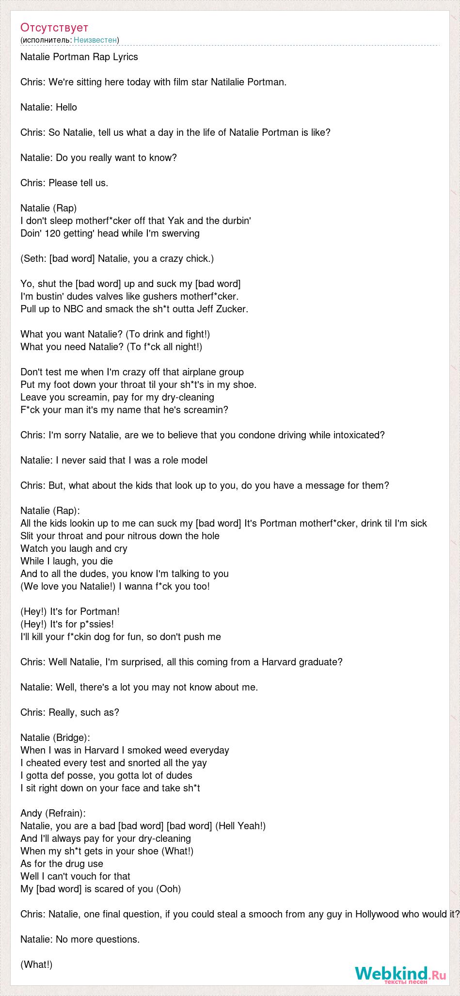 Natalie Portman Rap Lyrics Chris: We're sitting here today with film star Natilalie Portman. Natalie: Hello Chris: So Natalie, tell us what a day in the life of Natalie Portman is like? Natalie: Do you really want to know? Chris: Please tell us. Natalie (Rap) I don't sleep motherf*cker off that Yak and the durbin' Doin' 120 getting' head while I'm swerving (Seth: [bad word] Natalie, you a crazy chick.) Yo, shut the [bad word] up and suck my [bad word] I'm bustin' dudes valves like gushers motherf*cker. Pull up to NBC and smack the sh*t outta Jeff Zucker. What you want Natalie? (To drink and fight!) What you need Natalie? (To f*ck all night!) Don't test me when I'm crazy off that airplane group Put my foot down your throat til your sh*t's in my shoe. Leave you screamin, pay for my dry-cleaning F*ck your man it's my name that he's screamin? Chris: I'm sorry Natalie, are we to believe that you condone driving while intoxicated? Natalie: I never said that I was a role model Chris: But, what about the kids that look up to you, do you have a message for them? Natalie (Rap): All the kids lookin up to me can suck my [bad word] It's Portman motherf*cker, drink til I'm sick Slit your throat and pour nitrous down the hole Watch you laugh and cry While I laugh, you die And to all the dudes, you know I'm talking to you (We love you Natalie!) I wanna f*ck you too! (Hey!) It's for Portman! (Hey!) It's for p*ssies! I'll kill your f*ckin dog for fun, so don't push me Chris: Well Natalie, I'm surprised, all this coming from a Harvard graduate? Natalie: Well, there's a lot you may not know about me. Chris: Really, such as? Natalie (Bridge): When I was in Harvard I smoked weed everyday I cheated every test and snorted all the yay I gotta def posse, you gotta lot of dudes I sit right down on your face and take sh*t Andy (Refrain): Natalie, you are a bad [bad word] [bad word] (Hell Yeah!) And I'll always pay for your dry-cleaning When my sh*t gets in your shoe (What!) As for the drug use Well I can't vouch for that My [bad word] is scared of you (Ooh) Chris: Natalie, one final question, if you could steal a smooch from any guy in Hollywood who would it? Natalie: No more questions. (What!)