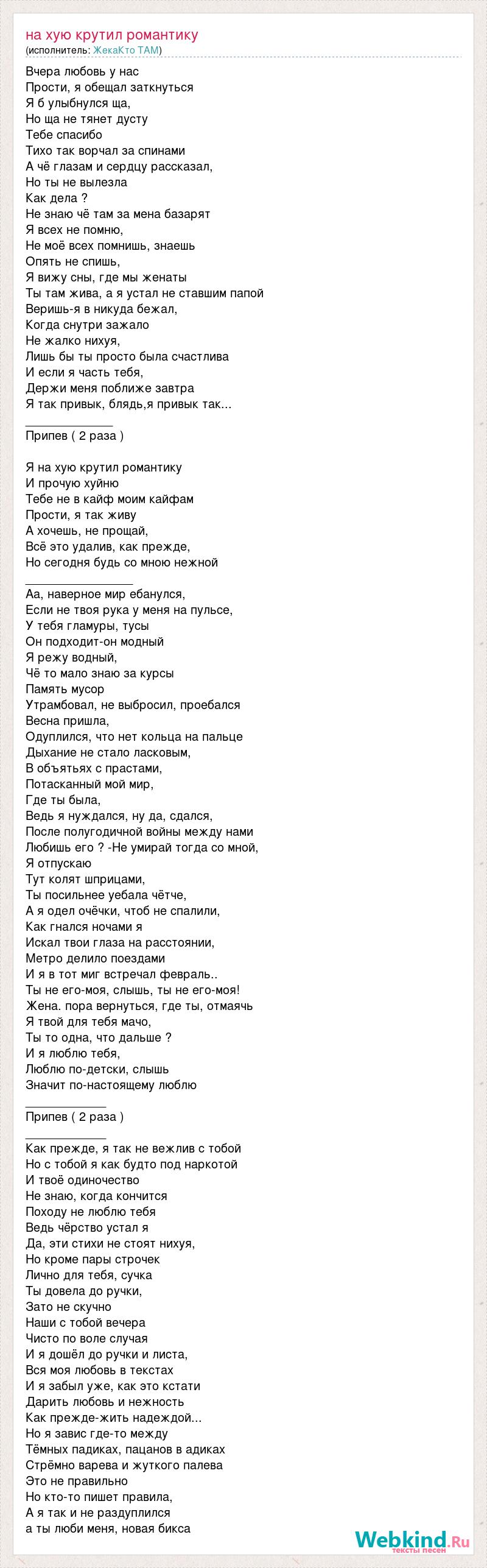 Вчера любовь у нас Прости, я обещал заткнуться Я б улыбнулся ща, Но ща не тянет дусту Тебе спасибо Тихо так ворчал за спинами А чё глазам и сердцу рассказал, Но ты не вылезла Как дела ? Не знаю чё там за мена базарят Я всех не помню, Не моё всех помнишь, знаешь Опять не спишь, Я вижу сны, где мы женаты Ты там жива, а я устал не ставшим папой Веришь-я в никуда бежал, Когда снутри зажало Не жалко нихуя, Лишь бы ты просто была счастлива И если я часть тебя, Держи меня поближе завтра Я так привык, блядь,я привык так... _____________ Припев ( 2 раза ) Я на хую крутил романтику И прочую хуйню Тебе не в кайф моим кайфам Прости, я так живу А хочешь, не прощай, Всё это удалив, как прежде, Но сегодня будь со мною нежной ________________ Аа, наверное мир ебанулся, Если не твоя рука у меня на пульсе, У тебя гламуры, тусы Он подходит-он модный Я режу водный, Чё то мало знаю за курсы Память мусор Утрамбовал, не выбросил, проебался Весна пришла, Одуплился, что нет кольца на пальце Дыхание не стало ласковым, В объятьях с прастами, Потасканный мой мир, Где ты была, Ведь я нуждался, ну да, сдался, После полугодичной войны между нами Любишь его ? -Не умирай тогда со мной, Я отпускаю Тут колят шприцами, Ты посильнее уебала чётче, А я одел очёчки, чтоб не спалили, Как гнался ночами я Искал твои глаза на расстоянии, Метро делило поездами И я в тот миг встречал февраль.. Ты не его-моя, слышь, ты не его-моя! Жена. пора вернуться, где ты, отмаячь Я твой для тебя мачо, Ты то одна, что дальше ? И я люблю тебя, Люблю по-детски, слышь Значит по-настоящему люблю ____________ Припев ( 2 раза ) ____________ Как прежде, я так не вежлив с тобой Но с тобой я как будто под наркотой И твоё одиночество Не знаю, когда кончится Походу не люблю тебя Ведь чёрство устал я Да, эти стихи не стоят нихуя, Но кроме пары строчек Лично для тебя, сучка Ты довела до ручки, Зато не скучно Наши с тобой вечера Чисто по воле случая И я дошёл до ручки и листа, Вся моя любовь в текстах И я забыл уже, как это кстати Дарить любовь и нежность Как прежде-жить надеждой... Но я завис где-то между Тёмных падиках, пацанов в адиках Стрёмно варева и жуткого палева Это не правильно Но кто-то пишет правила, А я так и не раздуплился а ты люби меня, новая бикса