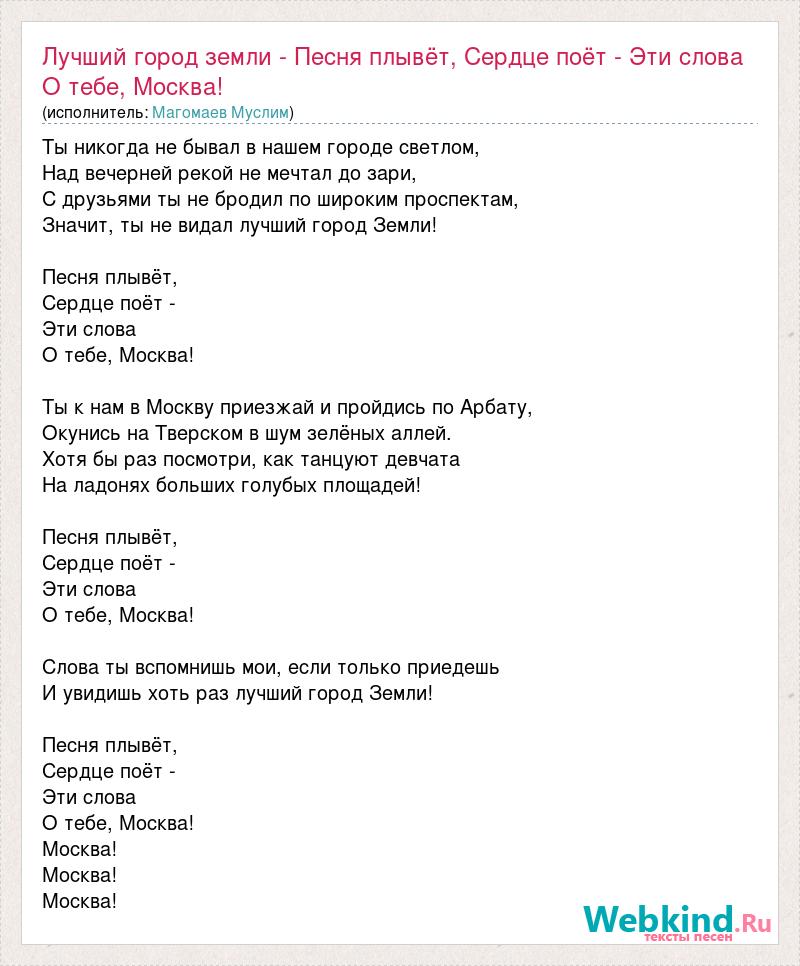 Ты никогда не бывал в нашем городе светлом, Над вечерней рекой не мечтал до зари, С друзьями ты не бродил по широким проспектам, Значит, ты не видал лучший город Земли! Песня плывёт, Сердце поёт - Эти слова О тебе, Москва! Ты к нам в Москву приезжай и пройдись по Арбату, Окунись на Тверском в шум зелёных аллей. Хотя бы раз посмотри, как танцуют девчата На ладонях больших голубых площадей! Песня плывёт, Сердце поёт - Эти слова О тебе, Москва! Слова ты вспомнишь мои, если только приедешь И увидишь хоть раз лучший город Земли! Песня плывёт, Сердце поёт - Эти слова О тебе, Москва! Москва! Москва! Москва!