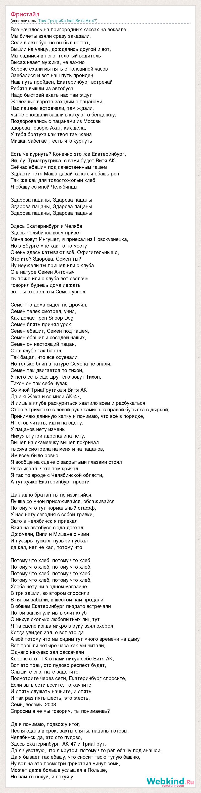 Все началось на пригородных кассах на вокзале, Мы билеты взяли сразу заказали, Сели в автобус, но он был не тот, Вышли на улицу, дождались другой и вот, Мы садимся в него, толстый водитель Высаживает мужика, не важно Короче ехали мы пять с половиной часов Заебалися и вот наш путь пройден, Наш путь пройден, Екатеринбург встречай Ребята вышли из автобуса Надо быстрей ехать нас там ждут Железные ворота заходим с пацанами, Нас пацаны встречали, там ждали, мы не опоздали зашли в какую то бендежку, Поздоровались с пацанами из Москвы здорова говорю Ахат, как дела, У тебя братуха как твоя там жена Мишан забегает, есть что курнуть Есть че курнуть? Конечно это же Екатеринбург, Эй, ёу, Триагрутрика, с вами будет Витя АК, Сейчас ебашим под качественным гашем Здрасти тетя Маша давай-ка как я ебашь рэп Так же как для толостожопый хлеб Я ебашу со мной Челябинцы Здарова пацаны, Здарова пацаны Здарова пацаны, Здарова пацаны Здарова пацаны, Здарова пацаны Здесь Екатеринбург и Челяба Здесь Челябинск всем привет Меня зовут Ингушет, я приехал из Новокузнецка, Но в Ебурге мне как то по месту Очень здесь катывают всё, Офигительные о, Это кто? Здорова, Семен ты? Ну неужели ты пришел или с клуба О в натуре Семен Антоныч ты тоже или с клуба вот сволочь говорил будешь дома лежать вот ты охерел, о и Семен успел Семен то дома сидел не дрочил, Семен телек смотрел, учил, Как делает рэп Snoop Dog, Семен блять принял урок, Семен ебашит, Семен под гашем, Семен ебашит и соседей наших, Семен он настоящий пацан, Он в клубе так бацал, Так бацал, что все охуевали, Но только блин в натуре Семена не знали, Семен так двигается по тихой, У него есть еще друг его зовут Тихон, Тихон он так себе чувак, Со мной ТриаГрутика я Витя АК Да а я Жека и со мной АК-47, И лишь в клубе раскуриться хватило всем и расбухаться Стою в гримерке в левой руке камина, в правой бутылка с дыркой, Принимаю длинную хапку и понимаю, что всё в порядке, Я готов читать, идти на сцену, У пацанов нету измены Нихуя внутри адреналина нету, Вышел на скамеечку вышел покричал тысяча смотрела на меня и на пацанов, Им всем было ровно Я вообще на сцене с закрытыми глазами стоял Чета играл, чета там кричал Я так то вроде с Челябинской области, А тут хуякс Екатеринбург прости Да ладно братан ты не извиняйся, Лучше со мной присаживайся, обсаживайся Потому что тут нормальный стафф, У нас нету сегодня с собой травки, Зато в Челябинск я приехал, Взял на автобусе сюда доехал Джомали, Випи и Мишане с ними И пузырь пускал, пузыри пускал да кал, нет не кал, потому что Потому что хлеб, потому что хлеб, Потому что хлеб, потому что хлеб, Потому что хлеб, потому что хлеб, Потому что хлеб, потому что хлеб, Хлеба нету ни в одном магазине В три зашли, во втором спросили В пятом забыли, в шестом нам продали В общем Екатеринбург пиздато встречали Потом заглянули мы в элит клуб О нихуя сколько любопытных лиц тут Я на сцене когда микро в руку взял охерел Когда увидел зал, о вот это да А всё потому что мы сидим тут много времени на дыму Вот прошли четыре часа как мы читали, Однако нехуево зал раскачали Короче это ТГК с нами нихуя себе Витя АК, Вот это трек, сто пудово респект будет, Слышите его, нате зацените, Посмотрите через сети, Екатеринбург спросите, Если вы в сети весите, то качните И опять слушать начните, и опять И так раз пять шесть, это жесть, Семь, восемь, 2008 Спросим а че мы гово