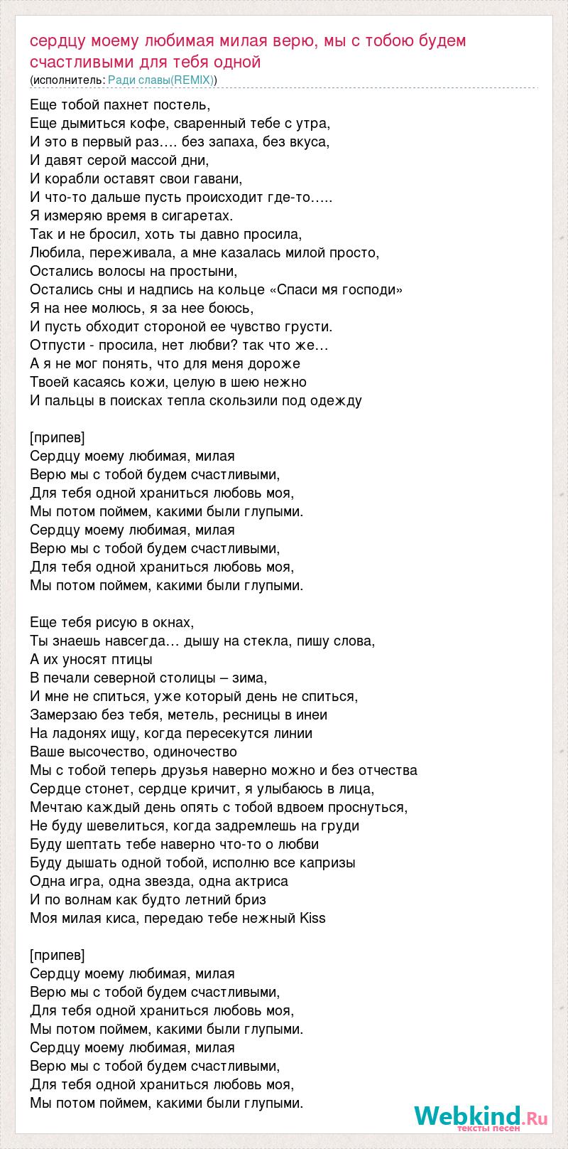 Главная→Исполнители→Ради славы(REMIX)→Сердцу моему любимая милая верю, мы с тобою будем счастливыми для тебя одной