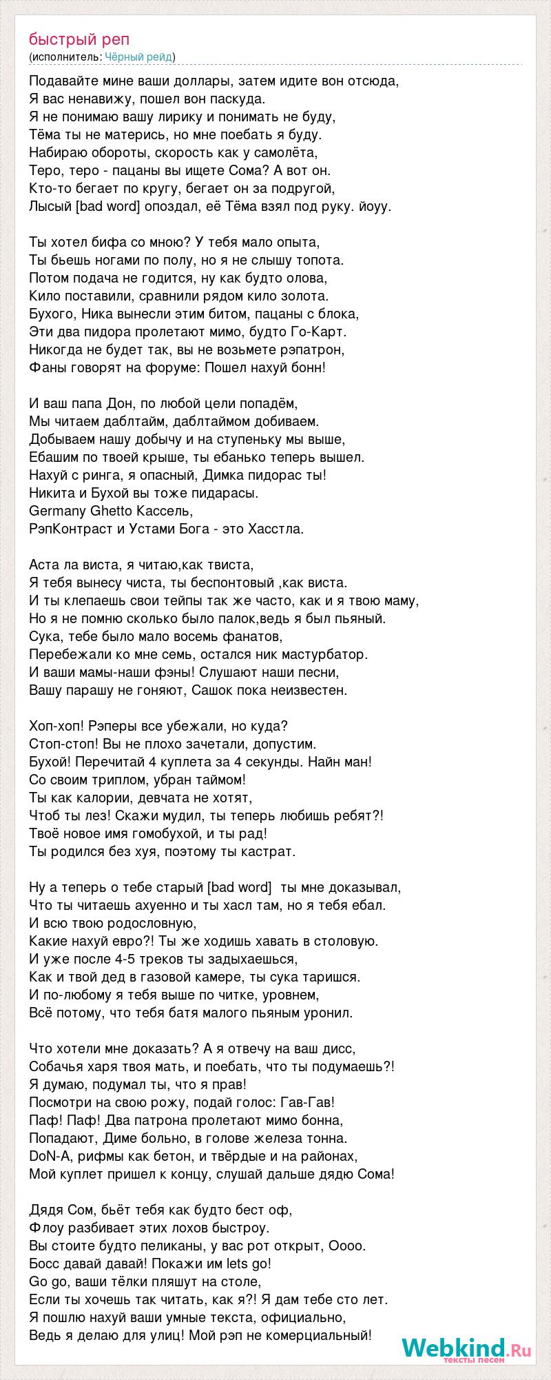 Подавайте мине ваши доллары, затем идите вон отсюда, Я вас ненавижу, пошел вон паскуда. Я не понимаю вашу лирику и понимать не буду, Тёма ты не матерись, но мне поебать я буду. Набираю обороты, скорость как у самолёта, Теро, теро - пацаны вы ищете Сома? А вот он. Кто-то бегает по кругу, бегает он за подругой, Лысый [bad word] опоздал, её Тёма взял под руку. йоуу. Ты хотел бифа со мною? У тебя мало опыта, Ты бьешь ногами по полу, но я не слышу топота. Потом подача не годится, ну как будто олова, Кило поставили, сравнили рядом кило золота. Бухого, Ника вынесли этим битом, пацаны с блока, Эти два пидора пролетают мимо, будто Го-Карт. Никогда не будет так, вы не возьмете рэпатрон, Фаны говорят на форуме: Пошел нахуй бонн! И ваш папа Дон, по любой цели попадём, Мы читаем даблтайм, даблтаймом добиваем. Добываем нашу добычу и на ступеньку мы выше, Ебашим по твоей крыше, ты ебанько теперь вышел. Нахуй с ринга, я опасный, Димка пидорас ты! Никита и Бухой вы тоже пидарасы. Germany Ghetto Кассель, РэпКонтраст и Устами Бога - это Хасстла. Аста ла виста, я читаю,как твиста, Я тебя вынесу чиста, ты беспонтовый ,как виста. И ты клепаешь свои тейпы так же часто, как и я твою маму, Но я не помню сколько было палок,ведь я был пьяный. Сука, тебе было мало восемь фанатов, Перебежали ко мне семь, остался ник мастурбатор. И ваши мамы-наши фэны! Слушают наши песни, Вашу парашу не гоняют, Сашок пока неизвестен. Хоп-хоп! Рэперы все убежали, но куда? Стоп-стоп! Вы не плохо зачетали, допустим. Бухой! Перечитай 4 куплета за 4 секунды. Найн ман! Со своим триплом, убран таймом! Ты как калории, девчата не хотят, Чтоб ты лез! Скажи мудил, ты теперь любишь ребят?! Твоё новое имя гомобухой, и ты рад! Ты родился без хуя, поэтому ты кастрат. Ну а теперь о тебе старый [bad word] ты мне доказывал, Что ты читаешь ахуенно и ты хасл там, но я тебя ебал. И всю твою родословную, Какие нахуй евро?! Ты же ходишь хавать в столовую. И уже после 4-5 треков ты задыхаешься, Как и твой дед в газовой камере, ты сука таришся. И по-любому я тебя выше по читке, уровнем, Всё потому, что тебя батя малого пьяным уронил. Что хотели мне доказать? А я отвечу на ваш дисс, Собачья харя твоя мать, и поебать, что ты подумаешь?! Я думаю, подумал ты, что я прав! Посмотри на свою рожу, подай голос: Гав-Гав! Паф! Паф! Два патрона пролетают мимо бонна, Попадают, Диме больно, в голове железа тонна. DoN-A, рифмы как бетон, и твёрдые и на районах, Мой куплет пришел к концу, слушай дальше дядю Сома! Дядя Сом, бьёт тебя как будто бест оф, Флоу разбивает этих лохов быстроу. Вы стоите будто пеликаны, у вас рот открыт, Оооо. Босс давай давай! Покажи им lets go! Go go, ваши тёлки пляшут на столе, Если ты хочешь так читать, как я?! Я дам тебе сто лет. Я пошлю нахуй ваши умные текста, официально, Ведь я делаю для улиц! Мой рэп не комерциальный!