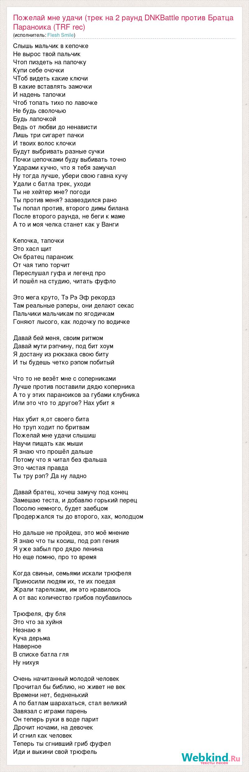Главная→Исполнители→Flesh Smile→Пожелай мне удачи (трек на 2 раунд DNKBattle против Братца Параноика (