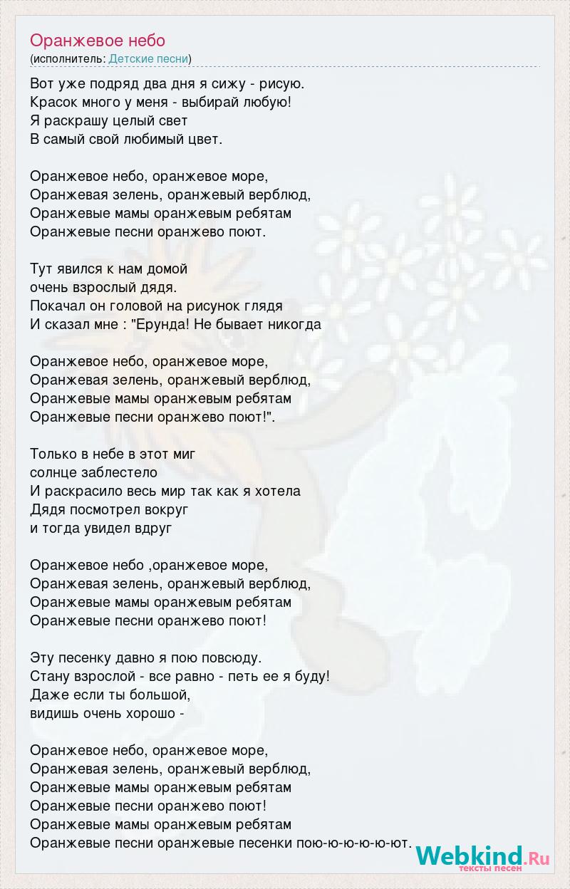 Вот уже подряд два дня я сижу - рисую. Красок много у меня - выбирай любую! Я раскрашу целый свет В самый свой любимый цвет. Оранжевое небо, оранжевое море, Оранжевая зелень, оранжевый верблюд, Оранжевые мамы оранжевым ребятам Оранжевые песни оранжево поют. Тут явился к нам домой очень взрослый дядя. Покачал он головой на рисунок глядя И сказал мне : "Ерунда! Не бывает никогда Оранжевое небо, оранжевое море, Оранжевая зелень, оранжевый верблюд, Оранжевые мамы оранжевым ребятам Оранжевые песни оранжево поют!". Только в небе в этот миг солнце заблестело И раскрасило весь мир так как я хотела Дядя посмотрел вокруг и тогда увидел вдруг Оранжевое небо ,оранжевое море, Оранжевая зелень, оранжевый верблюд, Оранжевые мамы оранжевым ребятам Оранжевые песни оранжево поют! Эту песенку давно я пою повсюду. Стану взрослой - все равно - петь ее я буду! Даже если ты большой, видишь очень хорошо - Оранжевое небо, оранжевое море, Оранжевая зелень, оранжевый верблюд, Оранжевые мамы оранжевым ребятам Оранжевые песни оранжево поют! Оранжевые мамы оранжевым ребятам Оранжевые песни оранжевые песенки пою-ю-ю-ю-ю-ют.