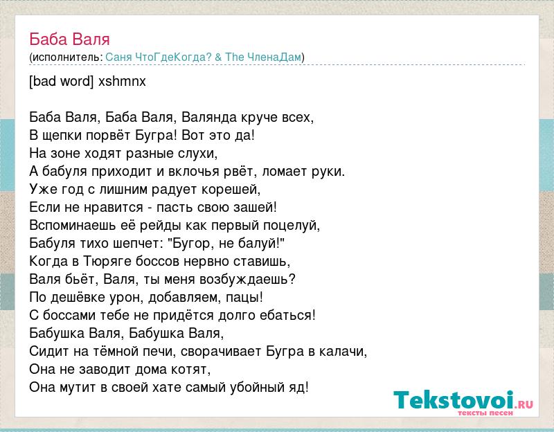 [bad word] xshmnx Баба Валя, Баба Валя, Валянда круче всех, В щепки порвёт Бугра! Вот это да! На зоне ходят разные слухи, А бабуля приходит и вклочья рвёт, ломает руки. Уже год с лишним радует корешей, Если не нравится - пасть свою зашей! Вспоминаешь её рейды как первый поцелуй, Бабуля тихо шепчет: "Бугор, не балуй!" Когда в Тюряге боссов нервно ставишь, Валя бьёт, Валя, ты меня возбуждаешь? По дешёвке урон, добавляем, пацы! С боссами тебе не придётся долго ебаться! Бабушка Валя, Бабушка Валя, Сидит на тёмной печи, сворачивает Бугра в калачи, Она не заводит дома котят, Она мутит в своей хате самый убойный яд!