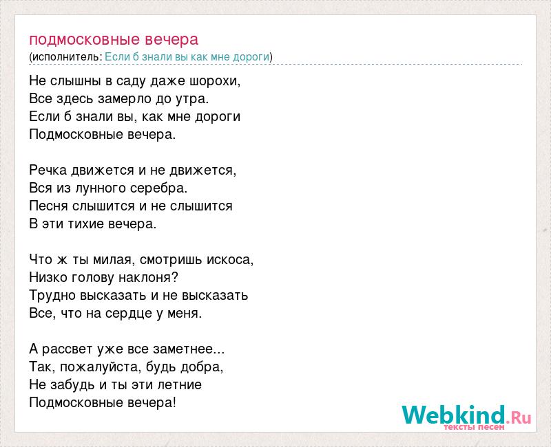 Не слышны в саду даже шорохи, Все здесь замерло до утра. Если б знали вы, как мне дороги Подмосковные вечера. Речка движется и не движется, Вся из лунного серебра. Песня слышится и не слышится В эти тихие вечера. Что ж ты милая, смотришь искоса, Низко голову наклоня? Трудно высказать и не высказать Все, что на сердце у меня. А рассвет уже все заметнее... Так, пожалуйста, будь добра, Не забудь и ты эти летние Подмосковные вечера!