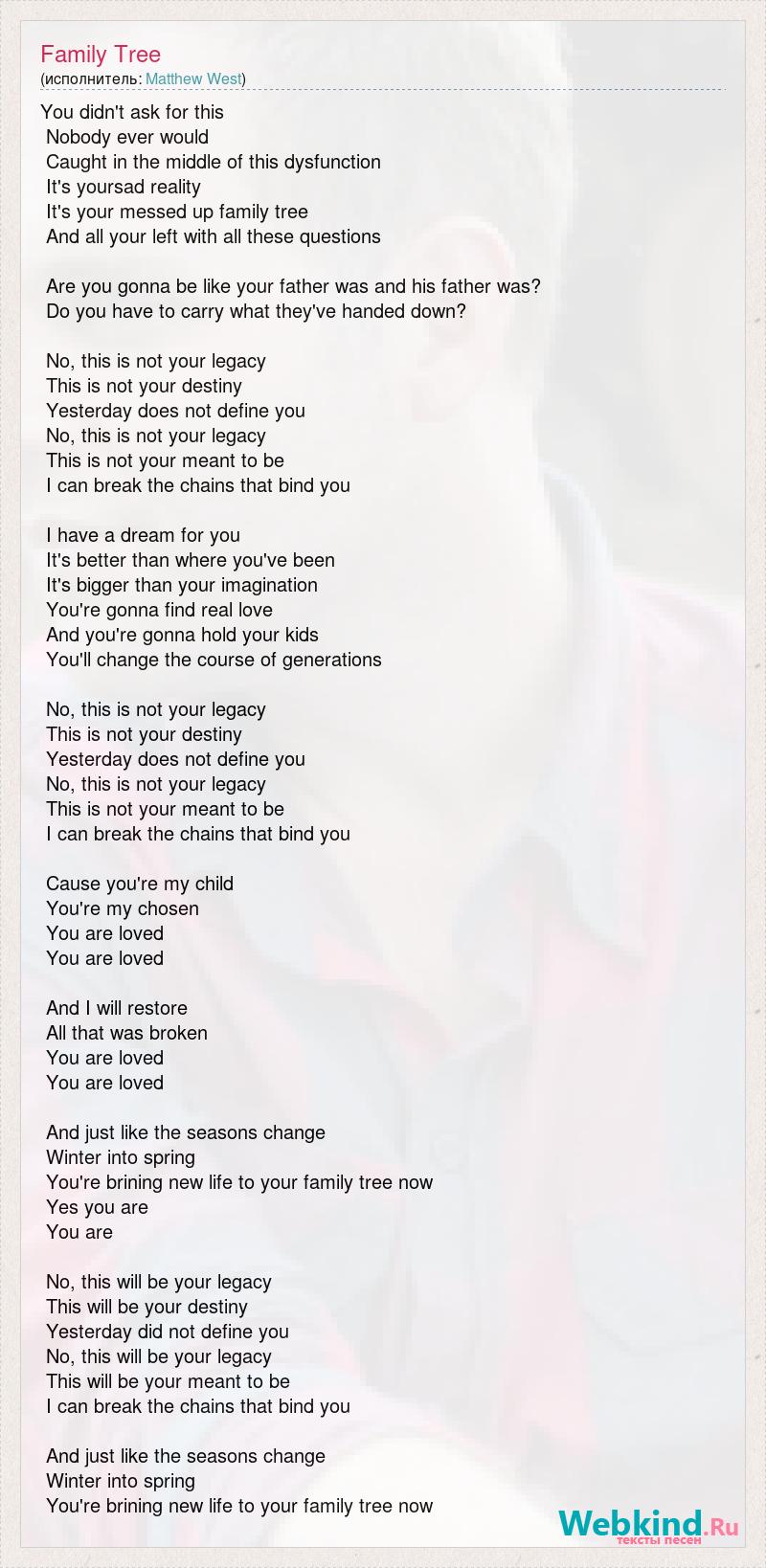 You didn't ask for this Nobody ever would Caught in the middle of this dysfunction It's yoursad reality It's your messed up family tree And all your left with all these questions Are you gonna be like your father was and his father was? Do you have to carry what they've handed down? No, this is not your legacy This is not your destiny Yesterday does not define you No, this is not your legacy This is not your meant to be I can break the chains that bind you I have a dream for you It's better than where you've been It's bigger than your imagination You're gonna find real love And you're gonna hold your kids You'll change the course of generations No, this is not your legacy This is not your destiny Yesterday does not define you No, this is not your legacy This is not your meant to be I can break the chains that bind you Cause you're my child You're my chosen You are loved You are loved And I will restore All that was broken You are loved You are loved And just like the seasons change Winter into spring You're brining new life to your family tree now Yes you are You are No, this will be your legacy This will be your destiny Yesterday did not define you No, this will be your legacy This will be your meant to be I can break the chains that bind you And just like the seasons change Winter into spring You're brining new life to your family tree now