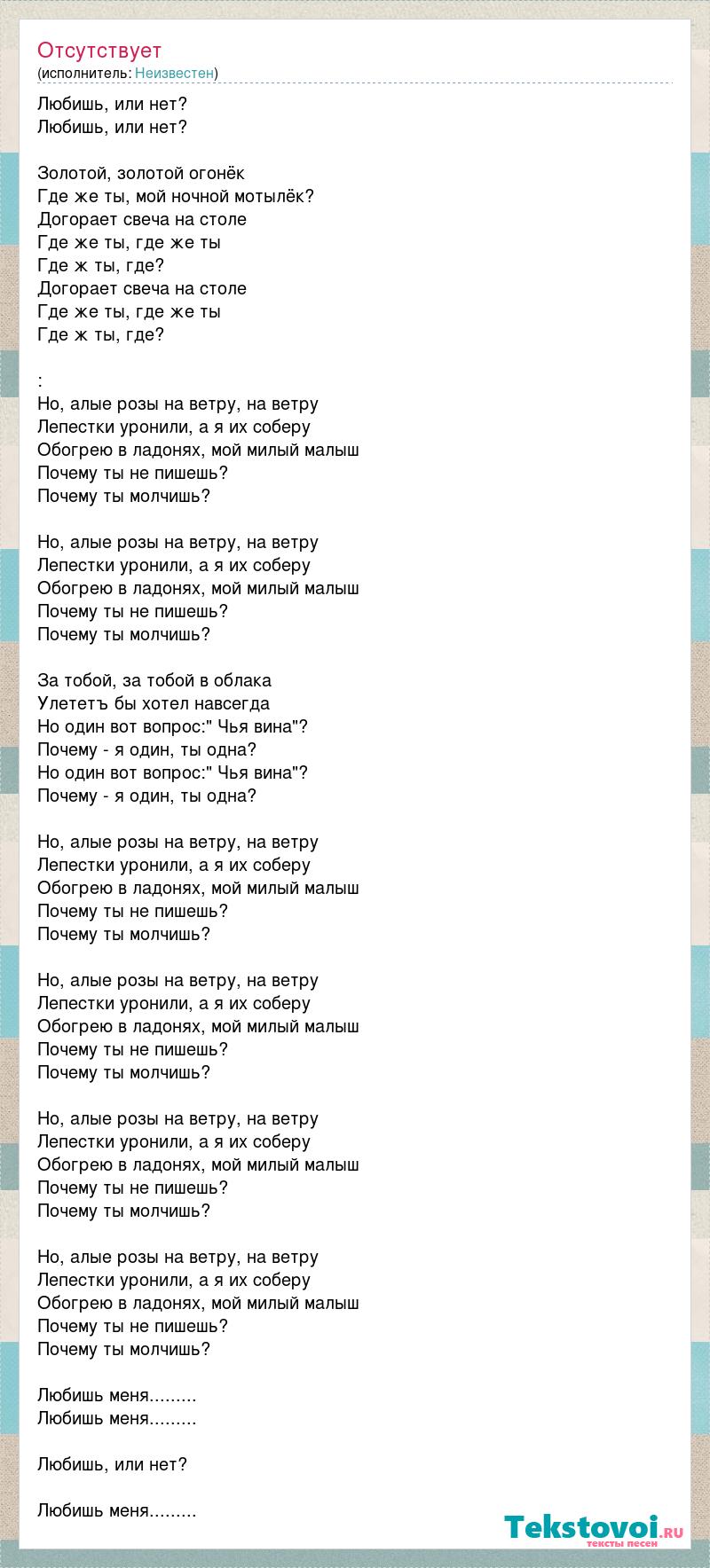 Любишь, или нет? Любишь, или нет? Золотой, золотой огонёк Где же ты, мой ночной мотылёк? Догорает свеча на столе Где же ты, где же ты Где ж ты, где? Догорает свеча на столе Где же ты, где же ты Где ж ты, где? : Но, алые розы на ветру, на ветру Лепестки уронили, а я их соберу Обогрею в ладонях, мой милый малыш Почему ты не пишешь? Почему ты молчишь? Но, алые розы на ветру, на ветру Лепестки уронили, а я их соберу Обогрею в ладонях, мой милый малыш Почему ты не пишешь? Почему ты молчишь? За тобой, за тобой в облака Улететъ бы хотел навсегда Но один вот вопрос:" Чья вина"? Почему - я один, ты одна? Но один вот вопрос:" Чья вина"? Почему - я один, ты одна? Но, алые розы на ветру, на ветру Лепестки уронили, а я их соберу Обогрею в ладонях, мой милый малыш Почему ты не пишешь? Почему ты молчишь? Но, алые розы на ветру, на ветру Лепестки уронили, а я их соберу Обогрею в ладонях, мой милый малыш Почему ты не пишешь? Почему ты молчишь? Но, алые розы на ветру, на ветру Лепестки уронили, а я их соберу Обогрею в ладонях, мой милый малыш Почему ты не пишешь? Почему ты молчишь? Но, алые розы на ветру, на ветру Лепестки уронили, а я их соберу Обогрею в ладонях, мой милый малыш Почему ты не пишешь? Почему ты молчишь? Любишь меня......... Любишь меня......... Любишь, или нет? Любишь меня.........