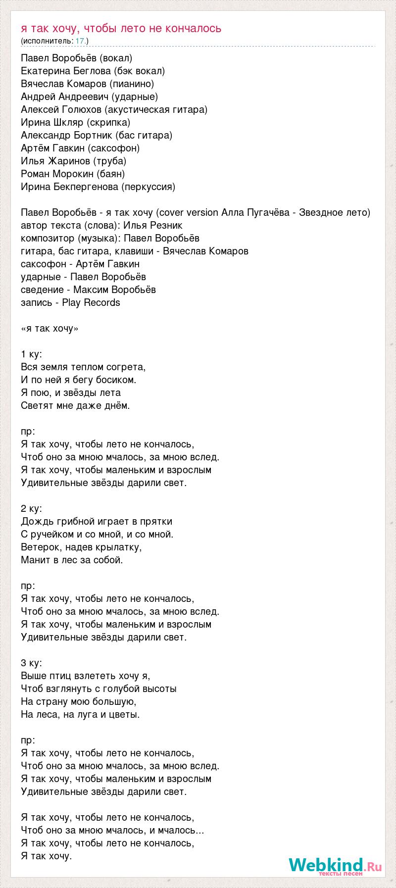 Павел Воробьёв (вокал) Екатерина Беглова (бэк вокал) Вячеслав Комаров (пианино) Андрей Андреевич (ударные) Алексей Голюхов (акустическая гитара) Ирина Шкляр (скрипка) Александр Бортник (бас гитара) Артём Гавкин (саксофон) Илья Жаринов (труба) Роман Морокин (баян) Ирина Бекпергенова (перкуссия) Павел Воробьёв - я так хочу (cover version Алла Пугачёва - Звездное лето) автор текста (слова): Илья Резник композитор (музыка): Павел Воробьёв гитара, бас гитара, клавиши - Вячеслав Комаров саксофон - Артём Гавкин ударные - Павел Воробьёв сведение - Максим Воробьёв запись - Play Records «я так хочу» 1 ку: Вся земля теплом согрета, И по ней я бегу босиком. Я пою, и звёзды лета Светят мне даже днём. пр: Я так хочу, чтобы лето не кончалось, Чтоб оно за мною мчалось, за мною вслед. Я так хочу, чтобы маленьким и взрослым Удивительные звёзды дарили свет. 2 ку: Дождь грибной играет в прятки С ручейком и со мной, и со мной. Ветерок, надев крылатку, Манит в лес за собой. пр: Я так хочу, чтобы лето не кончалось, Чтоб оно за мною мчалось, за мною вслед. Я так хочу, чтобы маленьким и взрослым Удивительные звёзды дарили свет. 3 ку: Выше птиц взлететь хочу я, Чтоб взглянуть с голубой высоты На страну мою большую, На леса, на луга и цветы. пр: Я так хочу, чтобы лето не кончалось, Чтоб оно за мною мчалось, за мною вслед. Я так хочу, чтобы маленьким и взрослым Удивительные звёзды дарили свет. Я так хочу, чтобы лето не кончалось, Чтоб оно за мною мчалось, и мчалось... Я так хочу, чтобы лето не кончалось, Я так хочу.