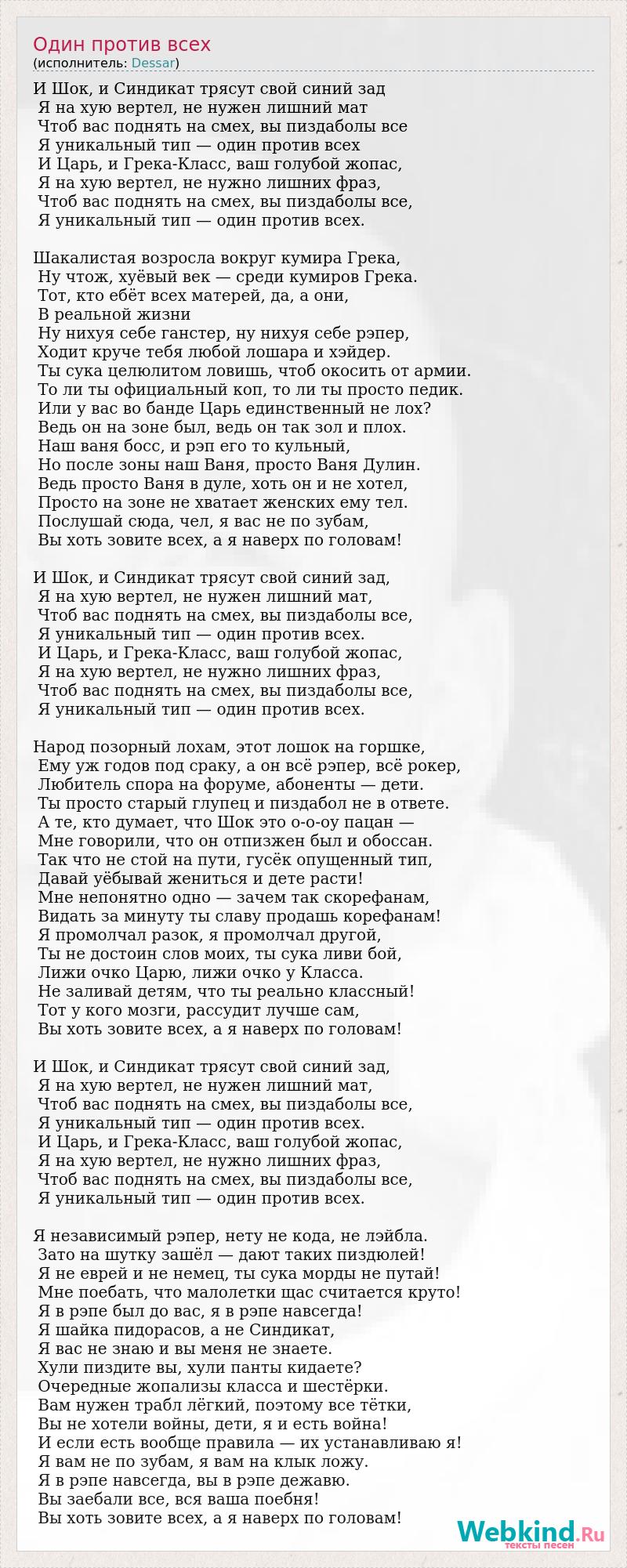 И Шок, и Синдикат трясут свой синий зад Я на хую вертел, не нужен лишний мат Чтоб вас поднять на смех, вы пиздаболы все Я уникальный тип — один против всех И Царь, и Грека-Класс, ваш голубой жопас, Я на хую вертел, не нужно лишних фраз, Чтоб вас поднять на смех, вы пиздаболы все, Я уникальный тип — один против всех. Шакалистая возросла вокруг кумира Грека, Ну чтож, хуёвый век — среди кумиров Грека. Тот, кто ебёт всех матерей, да, а они, В реальной жизни Ну нихуя себе ганстер, ну нихуя себе рэпер, Ходит круче тебя любой лошара и хэйдер. Ты сука целюлитом ловишь, чтоб окосить от армии. То ли ты официальный коп, то ли ты просто педик. Или у вас во банде Царь единственный не лох? Ведь он на зоне был, ведь он так зол и плох. Наш ваня босс, и рэп его то кульный, Но после зоны наш Ваня, просто Ваня Дулин. Ведь просто Ваня в дуле, хоть он и не хотел, Просто на зоне не хватает женских ему тел. Послушай сюда, чел, я вас не по зубам, Вы хоть зовите всех, а я наверх по головам! И Шок, и Синдикат трясут свой синий зад, Я на хую вертел, не нужен лишний мат, Чтоб вас поднять на смех, вы пиздаболы все, Я уникальный тип — один против всех. И Царь, и Грека-Класс, ваш голубой жопас, Я на хую вертел, не нужно лишних фраз, Чтоб вас поднять на смех, вы пиздаболы все, Я уникальный тип — один против всех. Народ позорный лохам, этот лошок на горшке, Ему уж годов под сраку, а он всё рэпер, всё рокер, Любитель спора на форуме, абоненты — дети. Ты просто старый глупец и пиздабол не в ответе. А те, кто думает, что Шок это о-о-оу пацан — Мне говорили, что он отпизжен был и обоссан. Так что не стой на пути, гусёк опущенный тип, Давай уёбывай жениться и дете расти! Мне непонятно одно — зачем так скорефанам, Видать за минуту ты славу продашь корефанам! Я промолчал разок, я промолчал другой, Ты не достоин слов моих, ты сука ливи бой, Лижи очко Царю, лижи очко у Класса. Не заливай детям, что ты реально классный! Тот у кого мозги, рассудит лучше сам, Вы хоть зовите всех, а я наверх по головам! И Шок, и Синдикат трясут свой синий зад, Я на хую вертел, не нужен лишний мат, Чтоб вас поднять на смех, вы пиздаболы все, Я уникальный тип — один против всех. И Царь, и Грека-Класс, ваш голубой жопас, Я на хую вертел, не нужно лишних фраз, Чтоб вас поднять на смех, вы пиздаболы все, Я уникальный тип — один против всех. Я независимый рэпер, нету не кода, не лэйбла. Зато на шутку зашёл — дают таких пиздюлей! Я не еврей и не немец, ты сука морды не путай! Мне поебать, что малолетки щас считается круто! Я в рэпе был до вас, я в рэпе навсегда! Я шайка пидорасов, а не Синдикат, Я вас не знаю и вы меня не знаете. Хули пиздите вы, хули панты кидаете? Очередные жопализы класса и шестёрки. Вам нужен трабл лёгкий, поэтому все тётки, Вы не хотели войны, дети, я и есть война! И если есть вообще правила — их устанавливаю я! Я вам не по зубам, я вам на клык ложу. Я в рэпе навсегда, вы в рэпе дежавю. Вы заебали все, вся ваша поебня! Вы хоть зовите всех, а я наверх по головам!