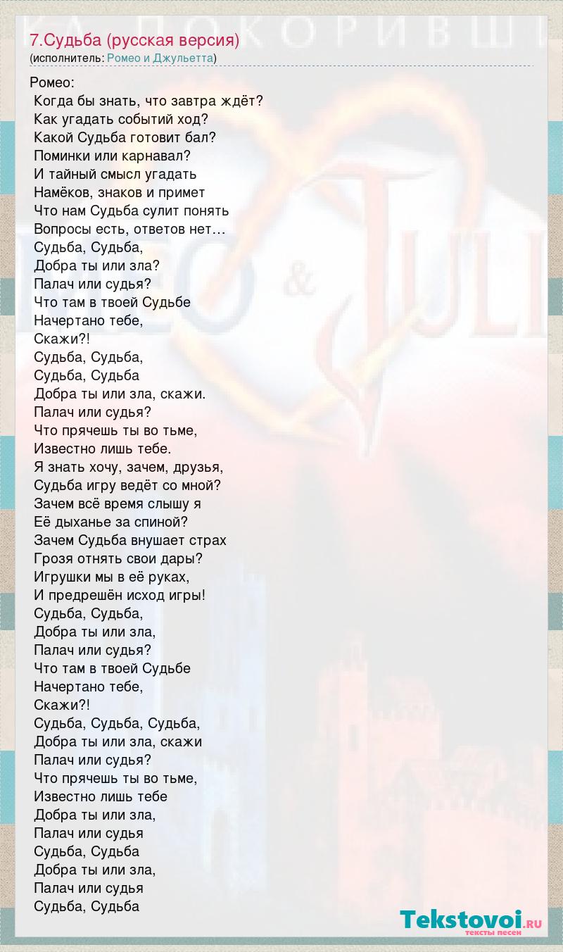 Ромео: Когда бы знать, что завтра ждёт? Как угадать событий ход? Какой Судьба готовит бал? Поминки или карнавал? И тайный смысл угадать Намёков, знаков и примет Что нам Судьба сулит понять Вопросы есть, ответов нет… Судьба, Судьба, Добра ты или зла? Палач или судья? Что там в твоей Судьбе Начертано тебе, Скажи?! Судьба, Судьба, Судьба, Судьба Добра ты или зла, скажи. Палач или судья? Что прячешь ты во тьме, Известно лишь тебе. Я знать хочу, зачем, друзья, Судьба игру ведёт со мной? Зачем всё время слышу я Её дыханье за спиной? Зачем Судьба внушает страх Грозя отнять свои дары? Игрушки мы в её руках, И предрешён исход игры! Судьба, Судьба, Добра ты или зла, Палач или судья? Что там в твоей Судьбе Начертано тебе, Скажи?! Судьба, Судьба, Судьба, Добра ты или зла, скажи Палач или судья? Что прячешь ты во тьме, Известно лишь тебе Добра ты или зла, Палач или судья Судьба, Судьба Добра ты или зла, Палач или судья Судьба, Судьба