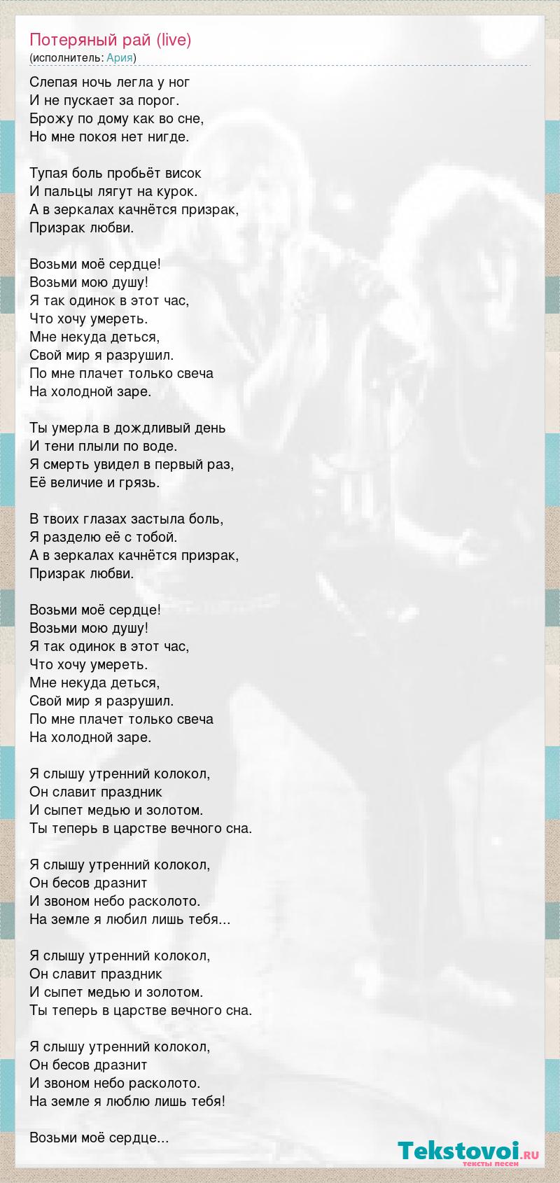 Слепая ночь легла у ног И не пускает за порог. Брожу по дому как во сне, Но мне покоя нет нигде. Тупая боль пробьёт висок И пальцы лягут на курок. А в зеркалах качнётся призрак, Призрак любви. Возьми моё сердце! Возьми мою душу! Я так одинок в этот час, Что хочу умереть. Мне некуда деться, Свой мир я разрушил. По мне плачет только свеча На холодной заре. Ты умерла в дождливый день И тени плыли по воде. Я смерть увидел в первый раз, Её величие и грязь. В твоих глазах застыла боль, Я разделю её с тобой. А в зеркалах качнётся призрак, Призрак любви. Возьми моё сердце! Возьми мою душу! Я так одинок в этот час, Что хочу умереть. Мне некуда деться, Свой мир я разрушил. По мне плачет только свеча На холодной заре. Я слышу утренний колокол, Он славит праздник И сыпет медью и золотом. Ты теперь в царстве вечного сна. Я слышу утренний колокол, Он бесов дразнит И звоном небо расколото. На земле я любил лишь тебя... Я слышу утренний колокол, Он славит праздник И сыпет медью и золотом. Ты теперь в царстве вечного сна. Я слышу утренний колокол, Он бесов дразнит И звоном небо расколото. На земле я люблю лишь тебя! Возьми моё сердце...