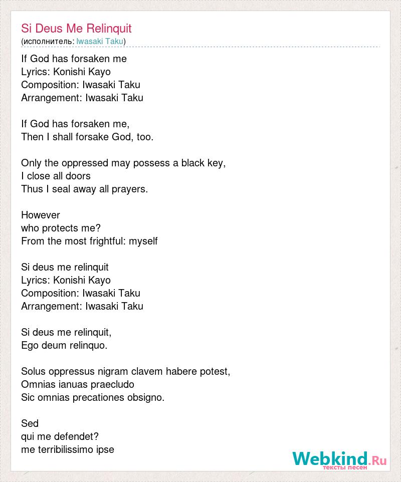 If God has forsaken me Lyrics: Konishi Kayo Composition: Iwasaki Taku Arrangement: Iwasaki Taku If God has forsaken me, Then I shall forsake God, too. Only the oppressed may possess a black key, I close all doors Thus I seal away all prayers. However who protects me? From the most frightful: myself Si deus me relinquit Lyrics: Konishi Kayo Composition: Iwasaki Taku Arrangement: Iwasaki Taku Si deus me relinquit, Ego deum relinquo. Solus oppressus nigram clavem habere potest, Omnias ianuas praecludo Sic omnias precationes obsigno. Sed qui me defendet? me terribilissimo ipse