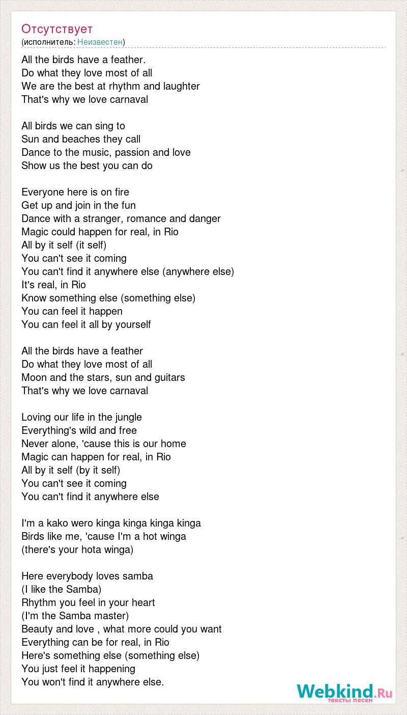 All the birds have a feather. Do what they love most of all We are the best at rhythm and laughter That's why we love carnaval All birds we can sing to Sun and beaches they call Dance to the music, passion and love Show us the best you can do Everyone here is on fire Get up and join in the fun Dance with a stranger, romance and danger Magic could happen for real, in Rio All by it self (it self) You can't see it coming You can't find it anywhere else (anywhere else) It's real, in Rio Know something else (something else) You can feel it happen You can feel it all by yourself All the birds have a feather Do what they love most of all Moon and the stars, sun and guitars That's why we love carnaval Loving our life in the jungle Everything's wild and free Never alone, 'cause this is our home Magic can happen for real, in Rio All by it self (by it self) You can't see it coming You can't find it anywhere else I'm a kako wero kinga kinga kinga kinga Birds like me, 'cause I'm a hot winga (there's your hota winga) Here everybody loves samba (I like the Samba) Rhythm you feel in your heart (I'm the Samba master) Beauty and love , what more could you want Everything can be for real, in Rio Here's something else (something else) You just feel it happening You won't find it anywhere else.