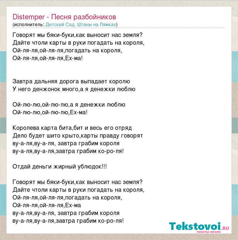 Говорят мы бяки-буки,как выносит нас земля? Дайте чтоли карты в руки погадать на короля, Ой-ля-ля,ой-ля-ля,погадать на короля, Ой-ля-ля,ой-ля-ля,Ех-ма! Завтра дальняя дорога выпадает королю У него денжонок много,а я денежки люблю Ой-лю-лю,ой-лю-лю,а я денежки люблю Ой-лю-лю,ой-лю-лю,Ех-ма! Королева карта бита,бит и весь его отряд Дело будет шито крыто,карты правду говорят ву-а-ля,ву-а-ля, завтра грабим короля ву-а-ля,ву-а-ля,завтра грабим ко-ро-ля! Отдай деньги жирный ублюдок!!! Говорят мы бяки-буки,как выносит нас земля? Дайте чтоли карты в руки погадать на короля, Ой-ля-ля,ой-ля-ля,погадать на короля, Ой-ля-ля,ой-ля-ля,Ех-ма ву-а-ля,ву-а-ля, завтра грабим короля ву-а-ля,ву-а-ля,завтра грабим ко-ро-ля!