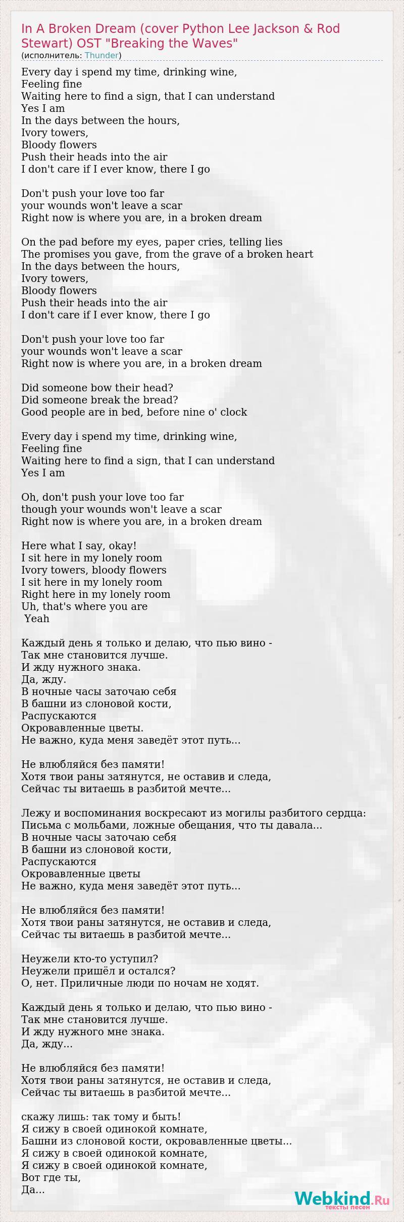 Every day i spend my time, drinking wine, Feeling fine Waiting here to find a sign, that I can understand Yes I am In the days between the hours, Ivory towers, Bloody flowers Push their heads into the air I don't care if I ever know, there I go Don't push your love too far your wounds won't leave a scar Right now is where you are, in a broken dream On the pad before my eyes, paper cries, telling lies The promises you gave, from the grave of a broken heart In the days between the hours, Ivory towers, Bloody flowers Push their heads into the air I don't care if I ever know, there I go Don't push your love too far your wounds won't leave a scar Right now is where you are, in a broken dream Did someone bow their head? Did someone break the bread? Good people are in bed, before nine o' clock Every day i spend my time, drinking wine, Feeling fine Waiting here to find a sign, that I can understand Yes I am Oh, don't push your love too far though your wounds won't leave a scar Right now is where you are, in a broken dream Here what I say, okay! I sit here in my lonely room Ivory towers, bloody flowers I sit here in my lonely room Right here in my lonely room Uh, that's where you are Yeah Каждый день я только и делаю, что пью вино - Так мне становится лучше. И жду нужного знака. Да, жду. В ночные часы заточаю себя В башни из слоновой кости, Распускаются Окровавленные цветы. Не важно, куда меня заведёт этот путь... Не влюбляйся без памяти! Хотя твои раны затянутся, не оставив и следа, Сейчас ты витаешь в разбитой мечте... Лежу и воспоминания воскресают из могилы разбитого сердца: Письма с мольбами, ложные обещания, что ты давала... В ночные часы заточаю себя В башни из слоновой кости, Распускаются Окровавленные цветы Не важно, куда меня заведёт этот путь... Не влюбляйся без памяти! Хотя твои раны затянутся, не оставив и следа, Сейчас ты витаешь в разбитой мечте... Неужели кто-то уступил? Неужели пришёл и остался? О, нет. Приличные люди по ночам не ходят. Каждый день я только и делаю, что пью вино - Так мне становится лучше. И жду нужного мне знака. Да, жду... Не влюбляйся без памяти! Хотя твои раны затянутся, не оставив и следа, Сейчас ты витаешь в разбитой мечте... скажу лишь: так тому и быть! Я сижу в своей одинокой комнате, Башни из слоновой кости, окровавленные цветы... Я сижу в своей одинокой комнате, Я сижу в своей одинокой комнате, Вот где ты, Да...