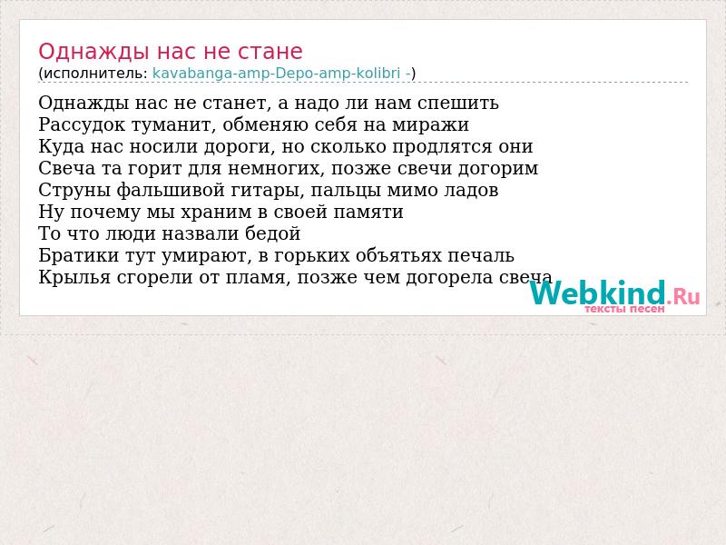 Однажды нас не станет, а надо ли нам спешить Рассудок туманит, обменяю себя на миражи Куда нас носили дороги, но сколько продлятся они Свеча та горит для немногих, позже свечи догорим Струны фальшивой гитары, пальцы мимо ладов Ну почему мы храним в своей памяти То что люди назвали бедой Братики тут умирают, в горьких объятьях печаль Крылья сгорели от пламя, позже чем догорела свеча