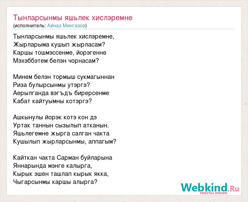 Тынларсынмы яшьлек хислэремне, Жырларыма кушып жырласам? Каршы тошмэссенме, йорэгенне Мэхэббэтем белэн чорнасам? Минем белэн тормыш сукмагыннан Риза булырсынмы утэргэ? Аерылганда вэгъдъ бирерсенме Кабат кайтуымны котэргэ? Ашкынулы йорэк котэ кон дэ Уртак таннын сызылып атканын. Яшьлегемне жырга салган чакта Кушылып жырларсынмы, аппагым? Кайткан чакта Сарман буйларына Яннарында мэнге калырга, Кырык эшен ташлап кырык якка, Чыгарсынмы каршы алырга?