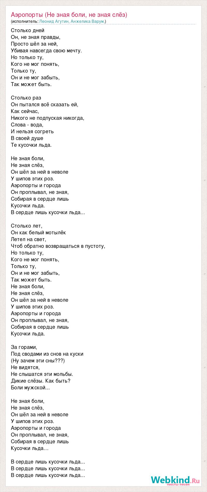 Столько дней Он, не зная правды, Просто шёл за ней, Убивая навсегда свою мечту. Но только ту, Кого не мог понять, Только ту, Он и не мог забыть, Так может быть. Столько раз Он пытался всё сказать ей, Как сейчас, Никого не подпуская никогда, Слова - вода, И нельзя согреть В своей душе Те кусочки льда. Не зная боли, Не зная слёз, Он шёл за ней в неволе У шипов этих роз. Аэропорты и города Он проплывал, не зная, Собирая в сердце лишь Кусочки льда. В сердце лишь кусочки льда... Столько лет, Он как белый мотылёк Летел на свет, Чтоб обратно возвращаться в пустоту, Но только ту, Кого не мог понять, Только ту, Он и не мог забыть, Так может быть. Не зная боли, Не зная слёз, Он шёл за ней в неволе У шипов этих роз. Аэропорты и города Он проплывал, не зная, Собирая в сердце лишь Кусочки льда. За горами, Под сводами из снов на куски (Ну зачем эти сны???) Не видятся, Не слышатся эти мольбы. Дикие слёзы. Как быть? Боли мужской... Не зная боли, Не зная слёз, Он шёл за ней в неволе У шипов этих роз. Аэропорты и города Он проплывал, не зная, Собирая в сердце лишь Кусочки льда… В сердце лишь кусочки льда... В сердце лишь кусочки льда... В сердце лишь кусочки льда...