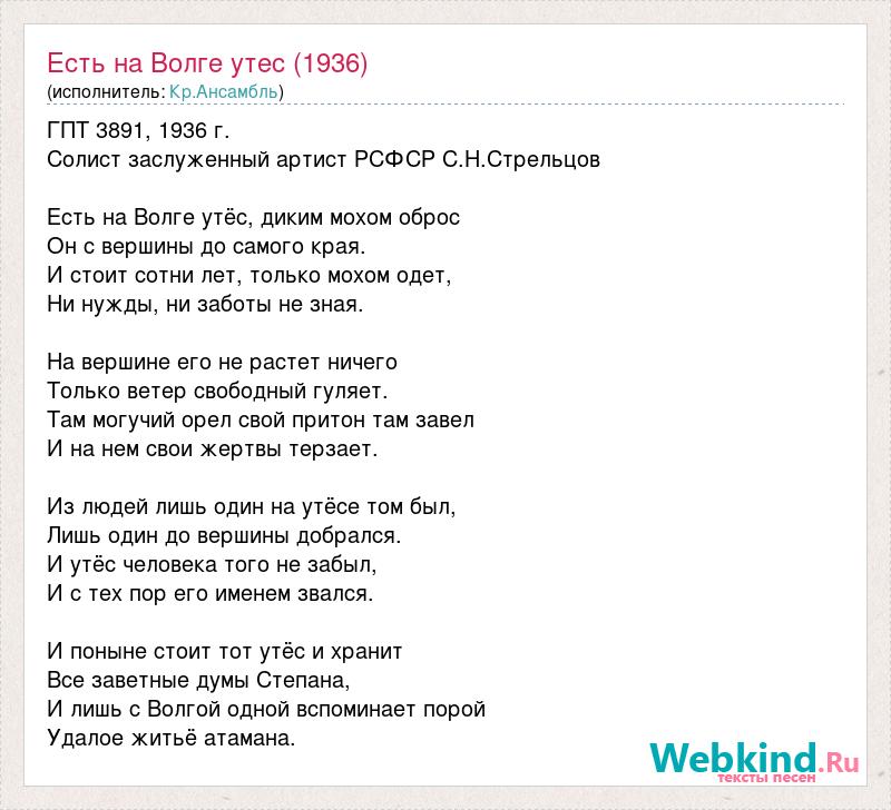 ГПТ 3891, 1936 г. Солист заслуженный артист РСФСР С.Н.Стрельцов Есть на Волге утёс, диким мохом оброс Он с вершины до самого края. И стоит сотни лет, только мохом одет, Ни нужды, ни заботы не зная. На вершине его не растет ничего Только ветер свободный гуляет. Там могучий орел свой притон там завел И на нем свои жертвы терзает. Из людей лишь один на утёсе том был, Лишь один до вершины добрался. И утёс человека того не забыл, И с тех пор его именем звался. И поныне стоит тот утёс и хранит Все заветные думы Степана, И лишь с Волгой одной вспоминает порой Удалое житьё атамана.