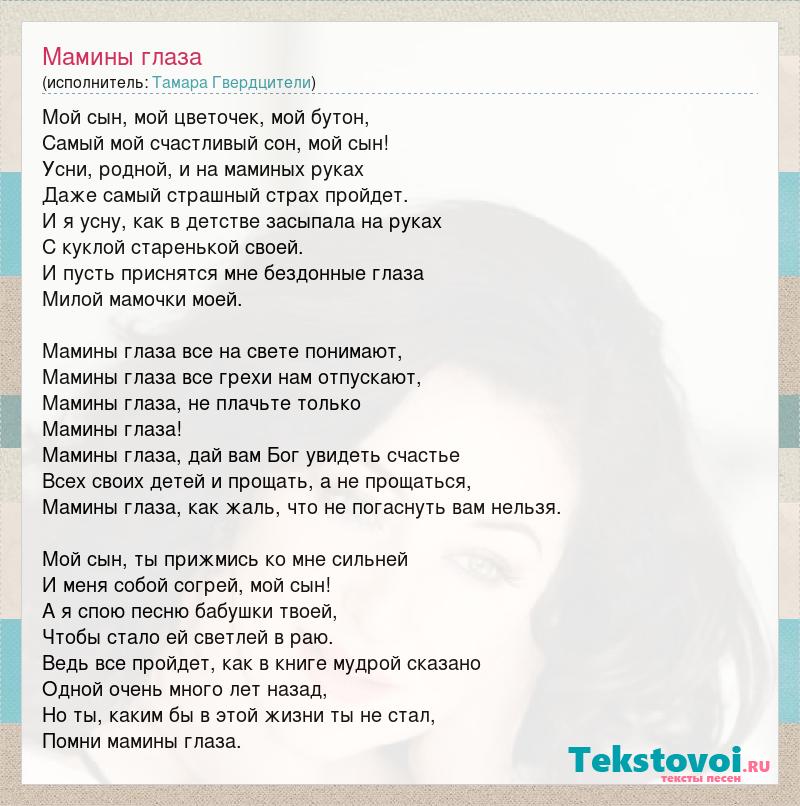 Мой сын, мой цветочек, мой бутон, Самый мой счастливый сон, мой сын! Усни, родной, и на маминых руках Даже самый страшный страх пройдет. И я усну, как в детстве засыпала на руках С куклой старенькой своей. И пусть приснятся мне бездонные глаза Милой мамочки моей. Мамины глаза все на свете понимают, Мамины глаза все грехи нам отпускают, Мамины глаза, не плачьте только Мамины глаза! Мамины глаза, дай вам Бог увидеть счастье Всех своих детей и прощать, а не прощаться, Мамины глаза, как жаль, что не погаснуть вам нельзя. Мой сын, ты прижмись ко мне сильней И меня собой согрей, мой сын! А я спою песню бабушки твоей, Чтобы стало ей светлей в раю. Ведь все пройдет, как в книге мудрой сказано Одной очень много лет назад, Но ты, каким бы в этой жизни ты не стал, Помни мамины глаза.