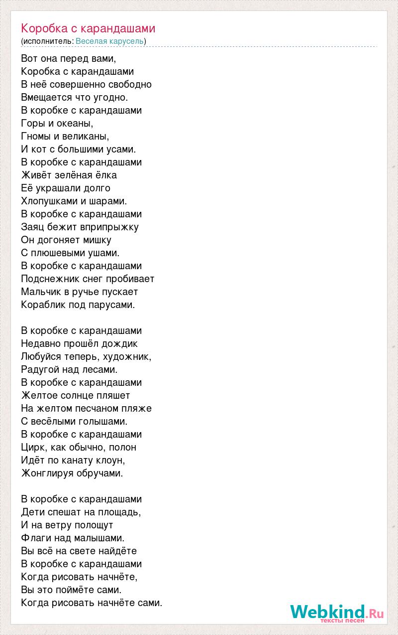 Вот она перед вами, Коробка с карандашами В неё совершенно свободно Вмещается что угодно. В коробке с карандашами Горы и океаны, Гномы и великаны, И кот с большими усами. В коробке с карандашами Живёт зелёная ёлка Её украшали долго Хлопушками и шарами. В коробке с карандашами Заяц бежит вприпрыжку Он догоняет мишку С плюшевыми ушами. В коробке с карандашами Подснежник снег пробивает Мальчик в ручье пускает Кораблик под парусами. В коробке с карандашами Недавно прошёл дождик Любуйся теперь, художник, Радугой над лесами. В коробке с карандашами Желтое солнце пляшет На желтом песчаном пляже С весёлыми голышами. В коробке с карандашами Цирк, как обычно, полон Идёт по канату клоун, Жонглируя обручами. В коробке с карандашами Дети спешат на площадь, И на ветру полощут Флаги над малышами. Вы всё на свете найдёте В коробке с карандашами Когда рисовать начнёте, Вы это поймёте сами. Когда рисовать начнёте сами.