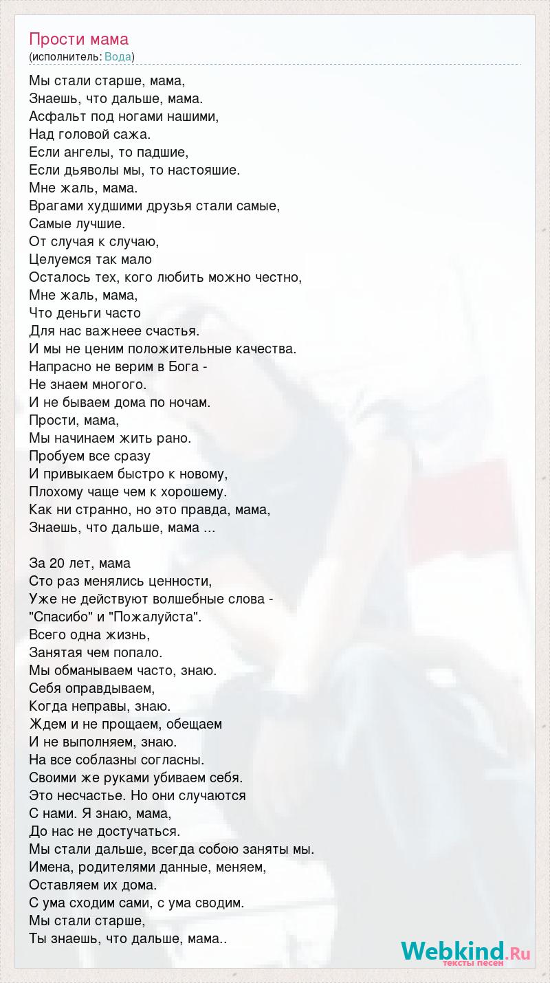 Мы стали старше, мама, Знаешь, что дальше, мама. Асфальт под ногами нашими, Над головой сажа. Если ангелы, то падшие, Если дьяволы мы, то настояшие. Мне жаль, мама. Врагами худшими друзья стали самые, Самые лучшие. От случая к случаю, Целуемся так мало Осталось тех, кого любить можно честно, Мне жаль, мама, Что деньги часто Для нас важнеее счастья. И мы не ценим положительные качества. Напрасно не верим в Бога - Не знаем многого. И не бываем дома по ночам. Прости, мама, Мы начинаем жить рано. Пробуем все сразу И привыкаем быстро к новому, Плохому чаще чем к хорошему. Как ни странно, но это правда, мама, Знаешь, что дальше, мама ... За 20 лет, мама Сто раз менялись ценности, Уже не действуют волшебные слова - "Спасибо" и "Пожалуйста". Всего одна жизнь, Занятая чем попало. Мы обманываем часто, знаю. Себя оправдываем, Когда неправы, знаю. Ждем и не прощаем, обещаем И не выполняем, знаю. На все соблазны согласны. Своими же руками убиваем себя. Это несчастье. Но они случаются С нами. Я знаю, мама, До нас не достучаться. Мы стали дальше, всегда собою заняты мы. Имена, родителями данные, меняем, Оставляем их дома. С ума сходим сами, с ума сводим. Мы стали старше, Ты знаешь, что дальше, мама..