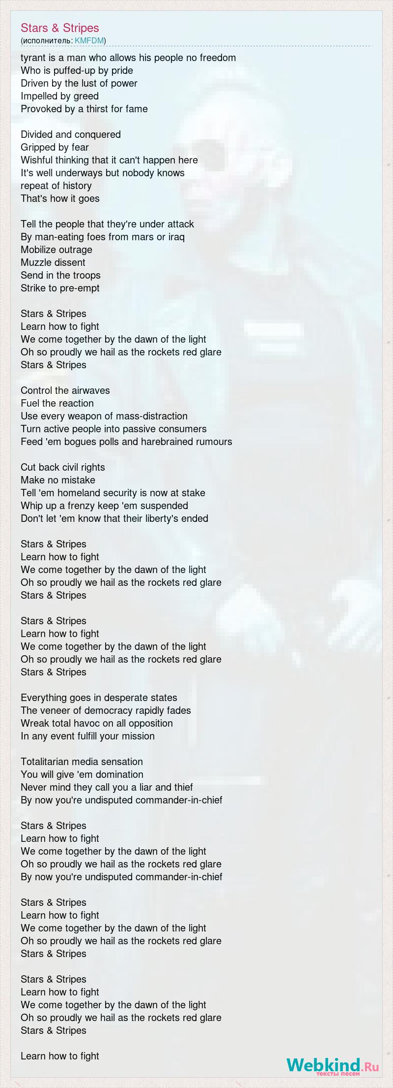 tyrant is a man who allows his people no freedom Who is puffed-up by pride Driven by the lust of power Impelled by greed Provoked by a thirst for fame Divided and conquered Gripped by fear Wishful thinking that it can't happen here It's well underways but nobody knows repeat of history That's how it goes Tell the people that they're under attack By man-eating foes from mars or iraq Mobilize outrage Muzzle dissent Send in the troops Strike to pre-empt Stars & Stripes Learn how to fight We come together by the dawn of the light Oh so proudly we hail as the rockets red glare Stars & Stripes Control the airwaves Fuel the reaction Use every weapon of mass-distraction Turn active people into passive consumers Feed 'em bogues polls and harebrained rumours Cut back civil rights Make no mistake Tell 'em homeland security is now at stake Whip up a frenzy keep 'em suspended Don't let 'em know that their liberty's ended Stars & Stripes Learn how to fight We come together by the dawn of the light Oh so proudly we hail as the rockets red glare Stars & Stripes Stars & Stripes Learn how to fight We come together by the dawn of the light Oh so proudly we hail as the rockets red glare Stars & Stripes Everything goes in desperate states The veneer of democracy rapidly fades Wreak total havoc on all opposition In any event fulfill your mission Totalitarian media sensation You will give 'em domination Never mind they call you a liar and thief By now you're undisputed commander-in-chief Stars & Stripes Learn how to fight We come together by the dawn of the light Oh so proudly we hail as the rockets red glare By now you're undisputed commander-in-chief Stars & Stripes Learn how to fight We come together by the dawn of the light Oh so proudly we hail as the rockets red glare Stars & Stripes Stars & Stripes Learn how to fight We come together by the dawn of the light Oh so proudly we hail as the rockets red glare Stars & Stripes Learn how to fight