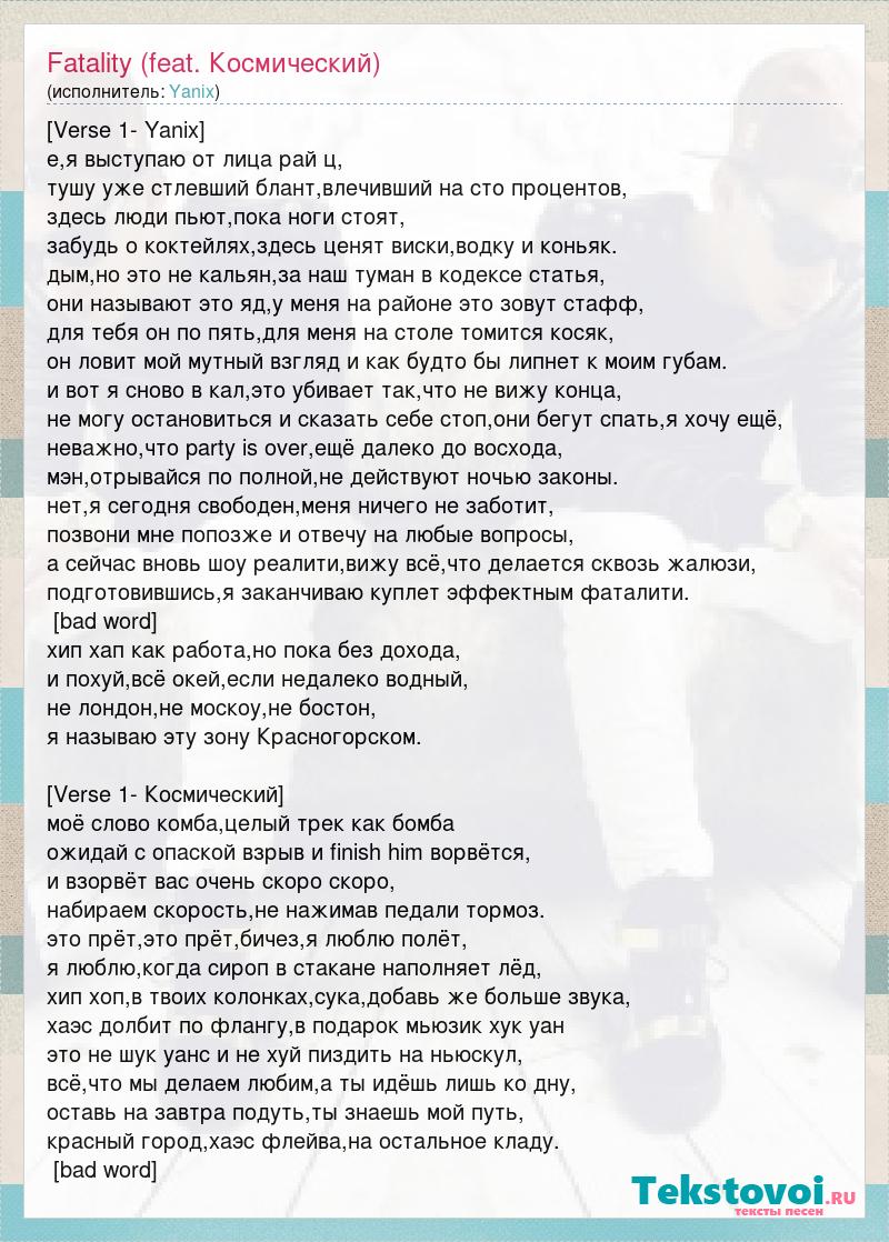 [Verse 1- Yanix] е,я выступаю от лица рай ц, тушу уже стлевший блант,влечивший на сто процентов, здесь люди пьют,пока ноги стоят, забудь о коктейлях,здесь ценят виски,водку и коньяк. дым,но это не кальян,за наш туман в кодексе статья, они называют это яд,у меня на районе это зовут стафф, для тебя он по пять,для меня на столе томится косяк, он ловит мой мутный взгляд и как будто бы липнет к моим губам. и вот я сново в кал,это убивает так,что не вижу конца, не могу остановиться и сказать себе стоп,они бегут спать,я хочу ещё, неважно,что party is over,ещё далеко до восхода, мэн,отрывайся по полной,не действуют ночью законы. нет,я сегодня свободен,меня ничего не заботит, позвони мне попозже и отвечу на любые вопросы, а сейчас вновь шоу реалити,вижу всё,что делается сквозь жалюзи, подготовившись,я заканчиваю куплет эффектным фаталити. [bad word] хип хап как работа,но пока без дохода, и похуй,всё окей,если недалеко водный, не лондон,не москоу,не бостон, я называю эту зону Красногорском. [Verse 1- Космический] моё слово комба,целый трек как бомба ожидай с опаской взрыв и finish him ворвётся, и взорвёт вас очень скоро скоро, набираем скорость,не нажимав педали тормоз. это прёт,это прёт,бичез,я люблю полёт, я люблю,когда сироп в стакане наполняет лёд, хип хоп,в твоих колонках,сука,добавь же больше звука, хаэс долбит по флангу,в подарок мьюзик хук уан это не шук уанс и не хуй пиздить на ньюскул, всё,что мы делаем любим,а ты идёшь лишь ко дну, оставь на завтра подуть,ты знаешь мой путь, красный город,хаэс флейва,на остальное кладу. [bad word]