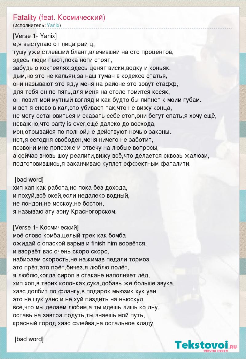 [Verse 1- Yanix] е,я выступаю от лица рай ц, тушу уже стлевший блант,влечивший на сто процентов, здесь люди пьют,пока ноги стоят, забудь о коктейлях,здесь ценят виски,водку и коньяк. дым,но это не кальян,за наш туман в кодексе статья, они называют это яд,у меня на районе это зовут стафф, для тебя он по пять,для меня на столе томится косяк, он ловит мой мутный взгляд и как будто бы липнет к моим губам. и вот я сново в кал,это убивает так,что не вижу конца, не могу остановиться и сказать себе стоп,они бегут спать,я хочу ещё, неважно,что party is over,ещё далеко до восхода, мэн,отрывайся по полной,не действуют ночью законы. нет,я сегодня свободен,меня ничего не заботит, позвони мне попозже и отвечу на любые вопросы, а сейчас вновь шоу реалити,вижу всё,что делается сквозь жалюзи, подготовившись,я заканчиваю куплет эффектным фаталити. [bad word] хип хап как работа,но пока без дохода, и похуй,всё окей,если недалеко водный, не лондон,не москоу,не бостон, я называю эту зону Красногорском. [Verse 1- Космический] моё слово комба,целый трек как бомба ожидай с опаской взрыв и finish him ворвётся, и взорвёт вас очень скоро скоро, набираем скорость,не нажимав педали тормоз. это прёт,это прёт,бичез,я люблю полёт, я люблю,когда сироп в стакане наполняет лёд, хип хоп,в твоих колонках,сука,добавь же больше звука, хаэс долбит по флангу,в подарок мьюзик хук уан это не шук уанс и не хуй пиздить на ньюскул, всё,что мы делаем любим,а ты идёшь лишь ко дну, оставь на завтра подуть,ты знаешь мой путь, красный город,хаэс флейва,на остальное кладу. [bad word]