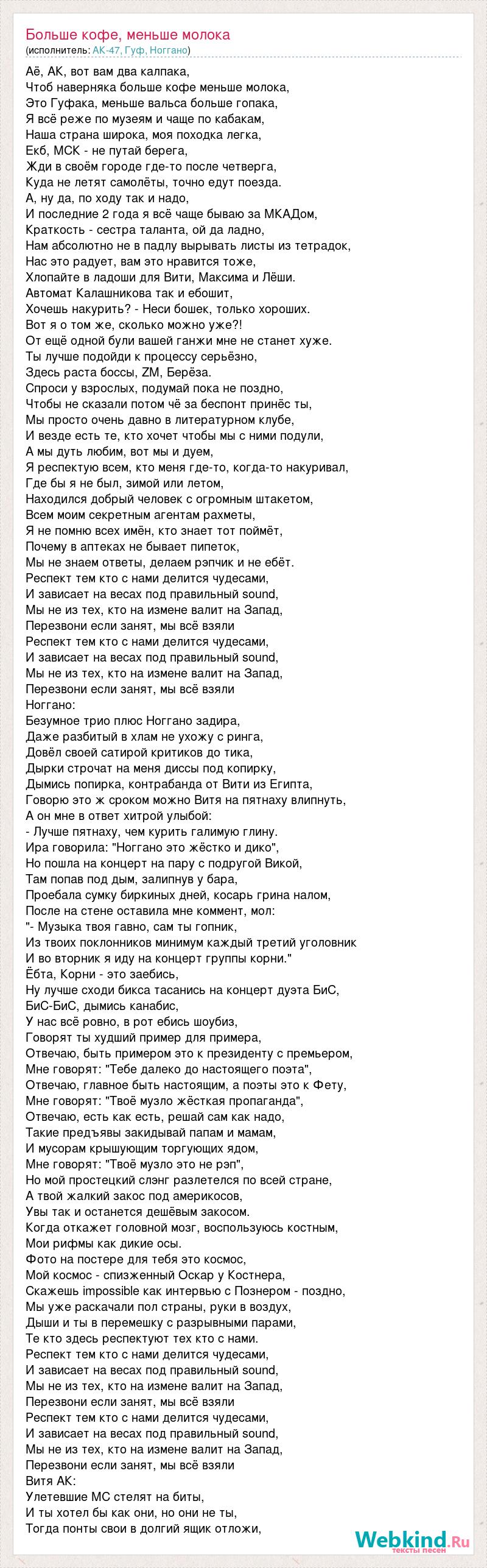 Аё, АК, вот вам два калпака, Чтоб наверняка больше кофе меньше молока, Это Гуфака, меньше вальса больше гопака, Я всё реже по музеям и чаще по кабакам, Наша страна широка, моя походка легка, Екб, МСК - не путай берега, Жди в своём городе где-то после четверга, Куда не летят самолёты, точно едут поезда. А, ну да, по ходу так и надо, И последние 2 года я всё чаще бываю за МКАДом, Краткость - сестра таланта, ой да ладно, Нам абсолютно не в падлу вырывать листы из тетрадок, Нас это радует, вам это нравится тоже, Хлопайте в ладоши для Вити, Максима и Лёши. Автомат Калашникова так и ебошит, Хочешь накурить? - Неси бошек, только хороших. Вот я о том же, сколько можно уже?! От ещё одной були вашей ганжи мне не станет хуже. Ты лучше подойди к процессу серьёзно, Здесь раста боссы, ZM, Берёза. Спроси у взрослых, подумай пока не поздно, Чтобы не сказали потом чё за беспонт принёс ты, Мы просто очень давно в литературном клубе, И везде есть те, кто хочет чтобы мы с ними подули, А мы дуть любим, вот мы и дуем, Я респектую всем, кто меня где-то, когда-то накуривал, Где бы я не был, зимой или летом, Находился добрый человек с огромным штакетом, Всем моим секретным агентам рахметы, Я не помню всех имён, кто знает тот поймёт, Почему в аптеках не бывает пипеток, Мы не знаем ответы, делаем рэпчик и не ебёт. Респект тем кто с нами делится чудесами, И зависает на весах под правильный sound, Мы не из тех, кто на измене валит на Запад, Перезвони если занят, мы всё взяли Респект тем кто с нами делится чудесами, И зависает на весах под правильный sound, Мы не из тех, кто на измене валит на Запад, Перезвони если занят, мы всё взяли Ноггано: Безумное трио плюс Ноггано задира, Даже разбитый в хлам не ухожу с ринга, Довёл своей сатирой критиков до тика, Дырки строчат на меня диссы под копирку, Дымись попирка, контрабанда от Вити из Египта, Говорю это ж сроком можно Витя на пятнаху влипнуть, А он мне в ответ хитрой улыбой: - Лучше пятнаху, чем курить галимую глину. Ира говорила: "Ноггано это жёстко и дико", Но пошла на концерт на пару с подругой Викой, Там попав под дым, залипнув у бара, Проебала сумку биркиных дней, косарь грина налом, После на стене оставила мне коммент, мол: "- Музыка твоя гавно, сам ты гопник, Из твоих поклонников минимум каждый третий уголовник И во вторник я иду на концерт группы корни." Ёбта, Корни - это заебись, Ну лучше сходи бикса тасанись на концерт дуэта БиС, БиС-БиС, дымись канабис, У нас всё ровно, в рот ебись шоубиз, Говорят ты худший пример для примера, Отвечаю, быть примером это к президенту с премьером, Мне говорят: "Тебе далеко до настоящего поэта", Отвечаю, главное быть настоящим, а поэты это к Фету, Мне говорят: "Твоё музло жёсткая пропаганда", Отвечаю, есть как есть, решай сам как надо, Такие предъявы закидывай папам и мамам, И мусорам крышующим торгующих ядом, Мне говорят: "Твоё музло это не рэп", Но мой простецкий слэнг разлетелся по всей стране, А твой жалкий закос под америкосов, Увы так и останется дешёвым закосом. Когда откажет головной мозг, воспользуюсь костным, Мои рифмы как дикие осы. Фото на постере для тебя это космос, Мой космос - спизженный Оскар у Костнера, Скажешь impossible как интервью с Познером - поздно, Мы уже раскачали пол страны, руки в воздух, Дыши и ты в перемешку с разрывными парами, Те кто здесь респектуют тех кто с нами. Респект тем кто с нами делится чудесами, И зависает на весах по