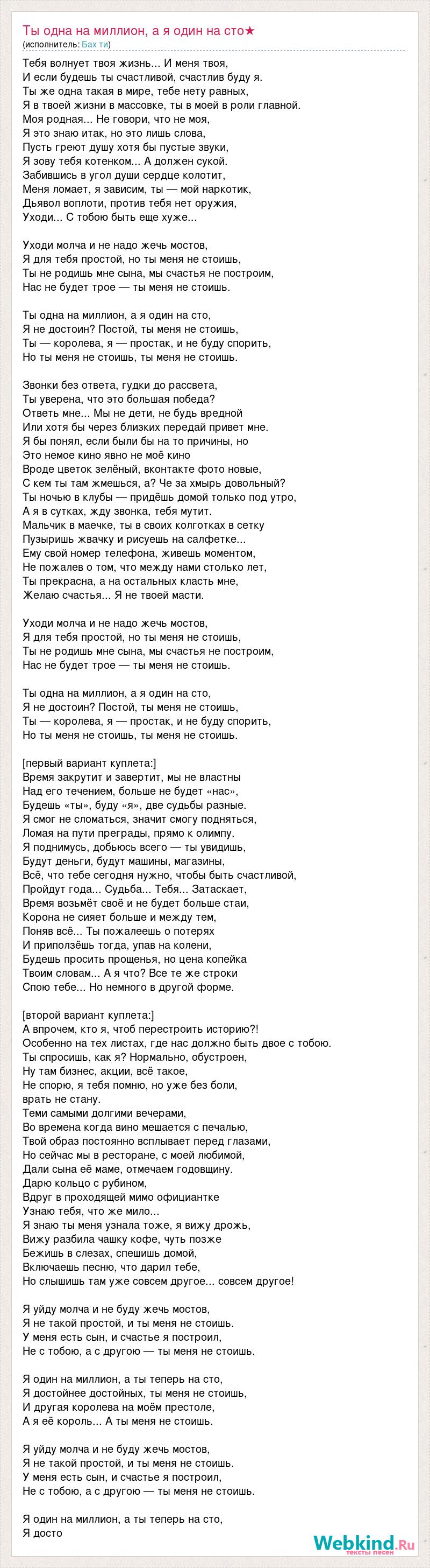 Тебя волнует твоя жизнь... И меня твоя, И если будешь ты счастливой, счастлив буду я. Ты же одна такая в мире, тебе нету равных, Я в твоей жизни в массовке, ты в моей в роли главной. Моя родная... Не говори, что не моя, Я это знаю итак, но это лишь слова, Пусть греют душу хотя бы пустые звуки, Я зову тебя котенком... А должен сукой. Забившись в угол души сердце колотит, Меня ломает, я зависим, ты — мой наркотик, Дьявол воплоти, против тебя нет оружия, Уходи... С тобою быть еще хуже... Уходи молча и не надо жечь мостов, Я для тебя простой, но ты меня не стоишь, Ты не родишь мне сына, мы счастья не построим, Нас не будет трое — ты меня не стоишь. Ты одна на миллион, а я один на сто, Я не достоин? Постой, ты меня не стоишь, Ты — королева, я — простак, и не буду спорить, Но ты меня не стоишь, ты меня не стоишь. Звонки без ответа, гудки до рассвета, Ты уверена, что это большая победа? Ответь мне... Мы не дети, не будь вредной Или хотя бы через близких передай привет мне. Я бы понял, если были бы на то причины, но Это немое кино явно не моё кино Вроде цветок зелёный, вконтакте фото новые, С кем ты там жмешься, а? Че за хмырь довольный? Ты ночью в клубы — придёшь домой только под утро, А я в сутках, жду звонка, тебя мутит. Мальчик в маечке, ты в своих колготках в сетку Пузыришь жвачку и рисуешь на салфетке... Ему свой номер телефона, живешь моментом, Не пожалев о том, что между нами столько лет, Ты прекрасна, а на остальных класть мне, Желаю счастья... Я не твоей масти. Уходи молча и не надо жечь мостов, Я для тебя простой, но ты меня не стоишь, Ты не родишь мне сына, мы счастья не построим, Нас не будет трое — ты меня не стоишь. Ты одна на миллион, а я один на сто, Я не достоин? Постой, ты меня не стоишь, Ты — королева, я — простак, и не буду спорить, Но ты меня не стоишь, ты меня не стоишь. [первый вариант куплета:] Время закрутит и завертит, мы не властны Над его течением, больше не будет «нас», Будешь «ты», буду «я», две судьбы разные. Я смог не сломаться, значит смогу подняться, Ломая на пути преграды, прямо к олимпу. Я поднимусь, добьюсь всего — ты увидишь, Будут деньги, будут машины, магазины, Всё, что тебе сегодня нужно, чтобы быть счастливой, Пройдут года... Судьба... Тебя... Затаскает, Время возьмёт своё и не будет больше стаи, Корона не сияет больше и между тем, Поняв всё... Ты пожалеешь о потерях И приползёшь тогда, упав на колени, Будешь просить прощенья, но цена копейка Твоим словам... А я что? Все те же строки Спою тебе... Но немного в другой форме. [второй вариант куплета:] А впрочем, кто я, чтоб перестроить историю?! Особенно на тех листах, где нас должно быть двое с тобою. Ты спросишь, как я? Нормально, обустроен, Ну там бизнес, акции, всё такое, Не спорю, я тебя помню, но уже без боли, врать не стану. Теми самыми долгими вечерами, Во времена когда вино мешается с печалью, Твой образ постоянно всплывает перед глазами, Но сейчас мы в ресторане, с моей любимой, Дали сына её маме, отмечаем годовщину. Дарю кольцо с рубином, Вдруг в проходящей мимо официантке Узнаю тебя, что же мило... Я знаю ты меня узнала тоже, я вижу дрожь, Вижу разбила чашку кофе, чуть позже Бежишь в слезах, спешишь домой, Включаешь песню, что дарил тебе, Но слышишь там уже совсем другое... совсем другое! Я уйду молча и не буду жечь мостов, Я не такой простой, и ты меня не стоишь. У меня есть сын, и счастье я построил, Не с тобою, а с другою — ты меня не стоишь. Я оди