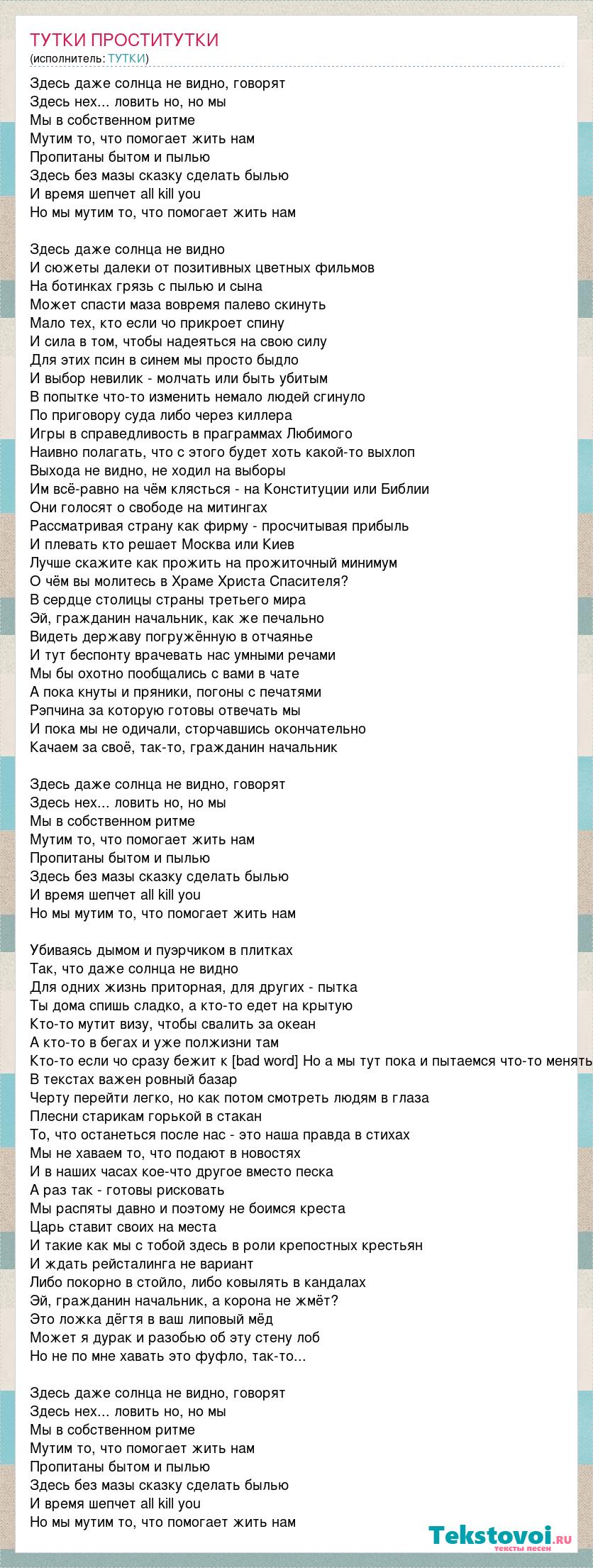 Здесь даже солнца не видно, говорят Здесь нех... ловить но, но мы Мы в собственном ритме Мутим то, что помогает жить нам Пропитаны бытом и пылью Здесь без мазы сказку сделать былью И время шепчет аll kill you Но мы мутим то, что помогает жить нам Здесь даже солнца не видно И сюжеты далеки от позитивных цветных фильмов На ботинках грязь с пылью и сына Может спасти маза вовремя палево скинуть Мало тех, кто если чо прикроет спину И сила в том, чтобы надеяться на свою силу Для этих псин в синем мы просто быдло И выбор невилик - молчать или быть убитым В попытке что-то изменить немало людей сгинуло По приговору суда либо через киллера Игры в справедливость в праграммах Любимого Наивно полагать, что с этого будет хоть какой-то выхлоп Выхода не видно, не ходил на выборы Им всё-равно на чём клясться - на Конституции или Библии Они голосят о свободе на митингах Рассматривая страну как фирму - просчитывая прибыль И плевать кто решает Москва или Киев Лучше скажите как прожить на прожиточный минимум О чём вы молитесь в Храме Христа Спасителя? В сердце столицы страны третьего мира Эй, гражданин начальник, как же печально Видеть державу погружённую в отчаянье И тут беспонту врачевать нас умными речами Мы бы охотно пообщались с вами в чате А пока кнуты и пряники, погоны с печатями Рэпчина за которую готовы отвечать мы И пока мы не одичали, сторчавшись окончательно Качаем за своё, так-то, гражданин начальник Здесь даже солнца не видно, говорят Здесь нех... ловить но, но мы Мы в собственном ритме Мутим то, что помогает жить нам Пропитаны бытом и пылью Здесь без мазы сказку сделать былью И время шепчет аll kill you Но мы мутим то, что помогает жить нам Убиваясь дымом и пуэрчиком в плитках Так, что даже солнца не видно Для одних жизнь приторная, для других - пытка Ты дома спишь сладко, а кто-то едет на крытую Кто-то мутит визу, чтобы свалить за океан А кто-то в бегах и уже полжизни там Кто-то если чо сразу бежит к [bad word] Но а мы тут пока и пытаемся что-то менять В текстах важен ровный базар Черту перейти легко, но как потом смотреть людям в глаза Плесни старикам горькой в стакан То, что останеться после нас - это наша правда в стихах Мы не хаваем то, что подают в новостях И в наших часах кое-что другое вместо песка А раз так - готовы рисковать Мы распяты давно и поэтому не боимся креста Царь ставит своих на места И такие как мы с тобой здесь в роли крепостных крестьян И ждать рейсталинга не вариант Либо покорно в стойло, либо ковылять в кандалах Эй, гражданин начальник, а корона не жмёт? Это ложка дёгтя в ваш липовый мёд Может я дурак и разобью об эту стену лоб Но не по мне хавать это фуфло, так-то... Здесь даже солнца не видно, говорят Здесь нех... ловить но, но мы Мы в собственном ритме Мутим то, что помогает жить нам Пропитаны бытом и пылью Здесь без мазы сказку сделать былью И время шепчет аll kill you Но мы мутим то, что помогает жить нам