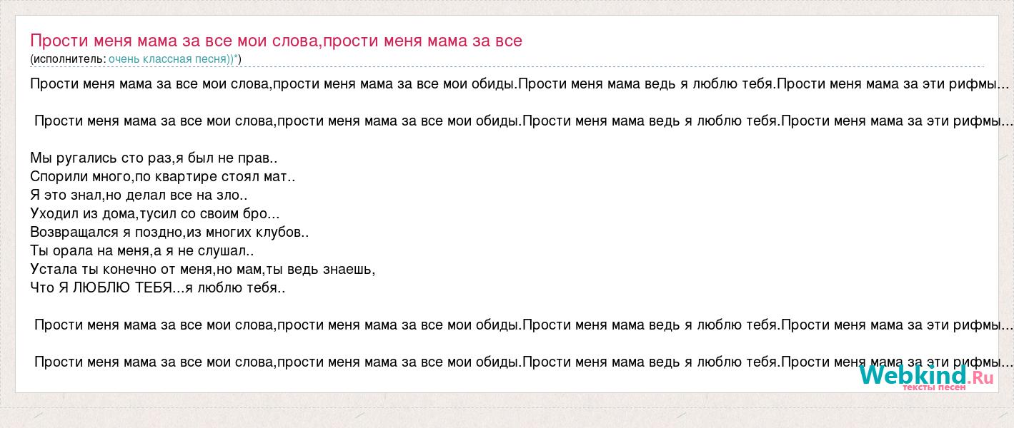 Прости меня мама за все мои слова,прости меня мама за все мои обиды.Прости меня мама ведь я люблю тебя.Прости меня мама за эти рифмы... Прости меня мама за все мои слова,прости меня мама за все мои обиды.Прости меня мама ведь я люблю тебя.Прости меня мама за эти рифмы... Мы ругались сто раз,я был не прав.. Спорили много,по квартире стоял мат.. Я это знал,но делал все на зло.. Уходил из дома,тусил со своим бро... Возвращался я поздно,из многих клубов.. Ты орала на меня,а я не слушал.. Устала ты конечно от меня,но мам,ты ведь знаешь, Что Я ЛЮБЛЮ ТЕБЯ...я люблю тебя.. Прости меня мама за все мои слова,прости меня мама за все мои обиды.Прости меня мама ведь я люблю тебя.Прости меня мама за эти рифмы... Прости меня мама за все мои слова,прости меня мама за все мои обиды.Прости меня мама ведь я люблю тебя.Прости меня мама за эти рифмы...