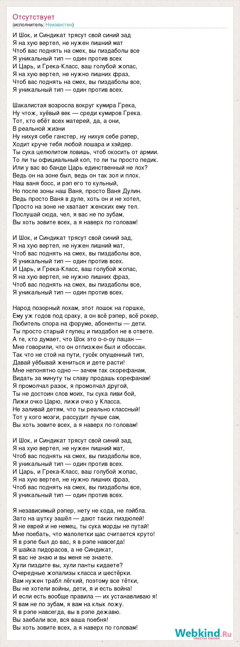 И Шок, и Синдикат трясут свой синий зад Я на хую вертел, не нужен лишний мат Чтоб вас поднять на смех, вы пиздаболы все Я уникальный тип — один против всех И Царь, и Грека-Класс, ваш голубой жопас, Я на хую вертел, не нужно лишних фраз, Чтоб вас поднять на смех, вы пиздаболы все, Я уникальный тип — один против всех. Шакалистая возросла вокруг кумира Грека, Ну чтож, хуёвый век — среди кумиров Грека. Тот, кто ебёт всех матерей, да, а они, В реальной жизни Ну нихуя себе ганстер, ну нихуя себе рэпер, Ходит круче тебя любой лошара и хэйдер. Ты сука целюлитом ловишь, чтоб окосить от армии. То ли ты официальный коп, то ли ты просто педик. Или у вас во банде Царь единственный не лох? Ведь он на зоне был, ведь он так зол и плох. Наш ваня босс, и рэп его то кульный, Но после зоны наш Ваня, просто Ваня Дулин. Ведь просто Ваня в дуле, хоть он и не хотел, Просто на зоне не хватает женских ему тел. Послушай сюда, чел, я вас не по зубам, Вы хоть зовите всех, а я наверх по головам! И Шок, и Синдикат трясут свой синий зад, Я на хую вертел, не нужен лишний мат, Чтоб вас поднять на смех, вы пиздаболы все, Я уникальный тип — один против всех. И Царь, и Грека-Класс, ваш голубой жопас, Я на хую вертел, не нужно лишних фраз, Чтоб вас поднять на смех, вы пиздаболы все, Я уникальный тип — один против всех. Народ позорный лохам, этот лошок на горшке, Ему уж годов под сраку, а он всё рэпер, всё рокер, Любитель спора на форуме, абоненты — дети. Ты просто старый глупец и пиздабол не в ответе. А те, кто думает, что Шок это о-о-оу пацан — Мне говорили, что он отпизжен был и обоссан. Так что не стой на пути, гусёк опущенный тип, Давай уёбывай жениться и дете расти! Мне непонятно одно — зачем так скорефанам, Видать за минуту ты славу продашь корефанам! Я промолчал разок, я промолчал другой, Ты не достоин слов моих, ты сука ливи бой, Лижи очко Царю, лижи очко у Класса. Не заливай детям, что ты реально классный! Тот у кого мозги, рассудит лучше сам, Вы хоть зовите всех, а я наверх по головам! И Шок, и Синдикат трясут свой синий зад, Я на хую вертел, не нужен лишний мат, Чтоб вас поднять на смех, вы пиздаболы все, Я уникальный тип — один против всех. И Царь, и Грека-Класс, ваш голубой жопас, Я на хую вертел, не нужно лишних фраз, Чтоб вас поднять на смех, вы пиздаболы все, Я уникальный тип — один против всех. Я независимый рэпер, нету не кода, не лэйбла. Зато на шутку зашёл — дают таких пиздюлей! Я не еврей и не немец, ты сука морды не путай! Мне поебать, что малолетки щас считается круто! Я в рэпе был до вас, я в рэпе навсегда! Я шайка пидорасов, а не Синдикат, Я вас не знаю и вы меня не знаете. Хули пиздите вы, хули панты кидаете? Очередные жопализы класса и шестёрки. Вам нужен трабл лёгкий, поэтому все тётки, Вы не хотели войны, дети, я и есть война! И если есть вообще правила — их устанавливаю я! Я вам не по зубам, я вам на клык ложу. Я в рэпе навсегда, вы в рэпе дежавю. Вы заебали все, вся ваша поебня! Вы хоть зовите всех, а я наверх по головам!